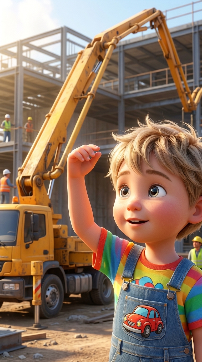 Art style: 3D Pixar. Крупный план на внука, который смотрит на автобетононасос. Он поднимает правую руку, сгибая ее в локте, и с улыбкой имитирует движение стрелы крана. На его лице восторг и сосредоточенность. ━━━━━━━━━━━━━━━━━━━━━━━━━━━━━━━━━━━━━━ FINAL STYLE ENFORCEMENT (this is the authoritative rendering directive — it overrides any style wording elsewhere in the prompt): Render this image entirely in "3D Pixar" style. Match the lighting grammar, material response, colour science, level of realism / stylisation, line weight, and shading model typical of "3D Pixar". Keep the subject, composition, camera angle, lighting direction, and colour palette from the description above — but EVERY surface, skin, fabric, material, and environmental element must be rendered in the "3D Pixar" idiom, not in any other medium. Character appearance reference (MUST match exactly): - Внук: Мальчик, 5-6 лет, с большими любопытными глазами и взъерошенными светлыми волосами. Одет в яркую футболку с рисунком машинки и джинсовый комбинезон. Восторженное и счастливое выражение лица. Стиль 3D-анимации Pixar. Reference images context (match the visual style and elements from these): - Про дедушка и внук (character): Пожилой мужчина с усами в синем кардигане и традиционной тюбетейке держит на руках малыша в сером костюме на фоне светлых узорчатых обоев. Портрет выполнен в спокойных тонах и передает атмосферу семейной преемственности и культурных традиций.