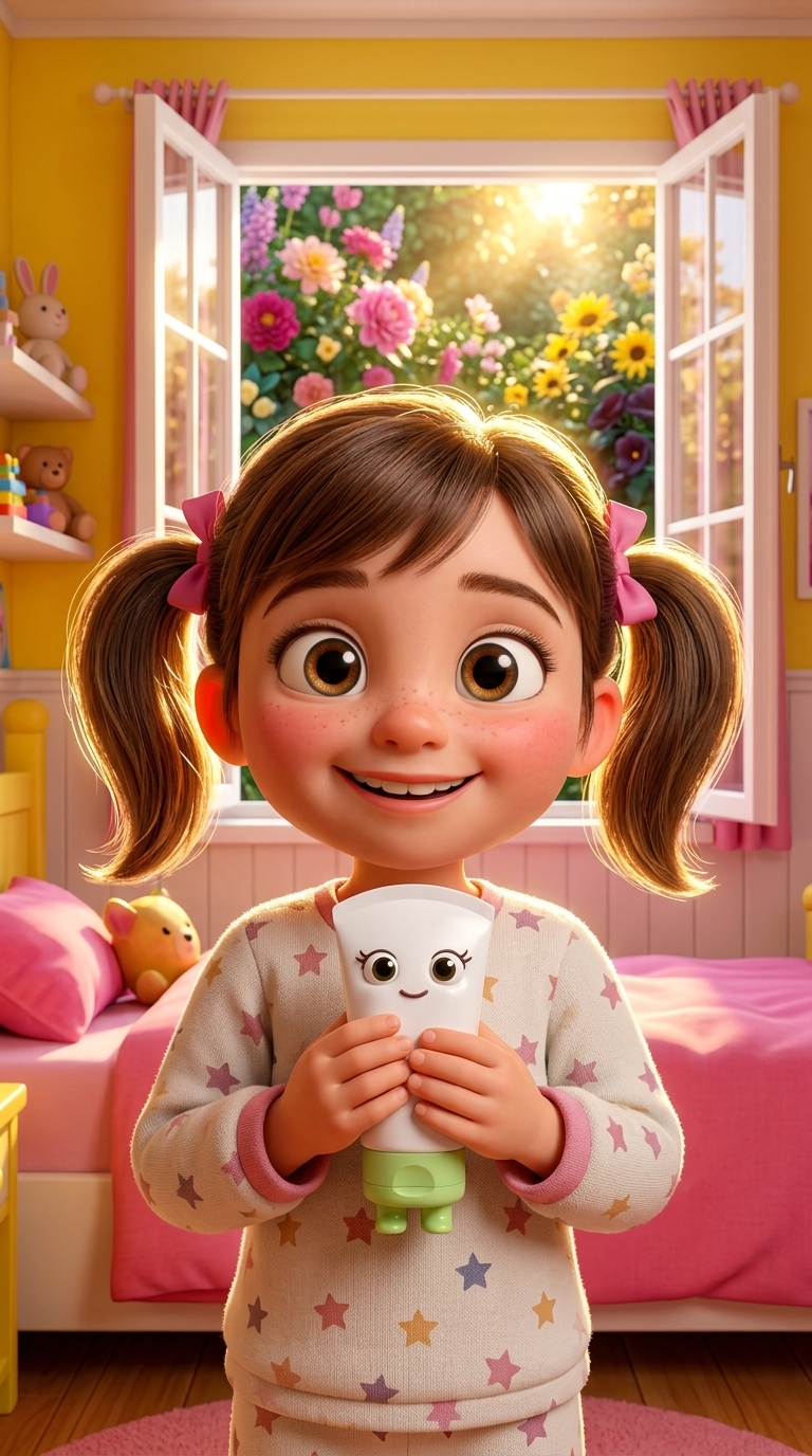 Art style: 3D Pixar. Сонячна дитяча спальня з відкритим вікном, через яке видно квітучий сад. Дівчинка радісно посміхається, тримаючи баночку крему обома руками біля серця. Камера знята з приближеною відстанню, фронтально. Освітлення тепле, сонячне, створює відблиски на волоссі. Настрій щасливий, енергійний та впевнений. Домінують яскраві кольори: жовтий, рожевий та насичений зелений. ━━━━━━━━━━━━━━━━━━━━━━━━━━━━━━━━━━━━━━ FINAL STYLE ENFORCEMENT (this is the authoritative rendering directive — it overrides any style wording elsewhere in the prompt): Render this image entirely in "3D Pixar" style. Match the lighting grammar, material response, colour science, level of realism / stylisation, line weight, and shading model typical of "3D Pixar". Keep the subject, composition, camera angle, lighting direction, and colour palette from the description above — but EVERY surface, skin, fabric, material, and environmental element must be rendered in the "3D Pixar" idiom, not in any other medium. Character appearance reference (MUST match exactly): - Марійка: Маленька дівчинка приблизно 7 років з великими допитливими карими очима та двома кумедними хвостиками, перев'язаними рожевими стрічками. Вона одягнена в затишну бавовняну піжаму з принтом маленьких зірочок. Її обличчя випромінює щиру радість та дитячу безпосередність. Навколо неї панує атмосфера тепла та домашнього затишку. Освітлення м'яке, з теплими золотистими відблисками на щоках. Стиль зображення нагадує сучасну високоякісну 3D-анімацію з надзвичайною деталізацією текстур тканини та волосся, створюючи відчуття об'єму та життя. Reference images context (match the visual style and elements from these): - Антропоморфный персонаж-тюбик крема (character): Белый тюбик детского крема с милым лицом, большими глазами, маленькими зелеными руками и ногами. Персонаж выполнен в мягких пастельных тонах на чистом белом фоне, создавая дружелюбное и нежное настроение. - Антропоморфный тюбик детского крема (character): Дружелюбный персонаж в виде тюбика крема HiPP с глазами и конечностями, парящий среди мягких, пушистых облаков в нежно-голубом небе. Изображение выполнено в мягком, чистом стиле с использованием пастельных тонов, создавая атмосферу нежности и заботы.