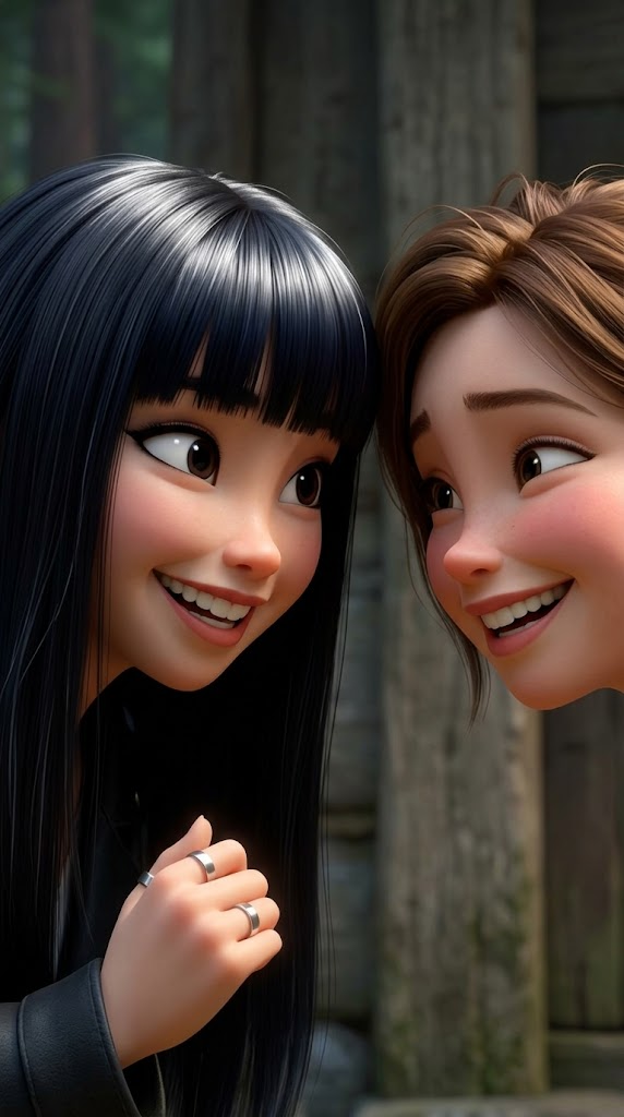 Art style: 3D Pixar. Крупный план на лицах двух других девушек, Саяны и Чимиты. Их глаза загораются от восторга, на лицах широкие улыбки. Они радостно переглядываются и кивают в знак согласия. Стиль Pixar, акцент на ярких эмоциях. ━━━━━━━━━━━━━━━━━━━━━━━━━━━━━━━━━━━━━━ FINAL STYLE ENFORCEMENT (this is the authoritative rendering directive — it overrides any style wording elsewhere in the prompt): Render this image entirely in "3D Pixar" style. Match the lighting grammar, material response, colour science, level of realism / stylisation, line weight, and shading model typical of "3D Pixar". Keep the subject, composition, camera angle, lighting direction, and colour palette from the description above — but EVERY surface, skin, fabric, material, and environmental element must be rendered in the "3D Pixar" idiom, not in any other medium. Character appearance reference (MUST match exactly): - Саяна: Молодая девушка азиатской внешности с бледной кожей и изящными чертами лица. У неё длинные, прямые иссиня-черные волосы с густой ровной челкой, на которых играют яркие серебристые блики. Большие, выразительные темно-карие глаза с густыми ресницами и четкой подводкой смотрят прямо на зрителя. Губы мягкого красноватого оттенка, кончик носа слегка розовый. Она стройного телосложения, одета в темную куртку поверх светлого воротника. На среднем и безымянном пальцах правой руки надеты тонкие серебряные кольца. Она держит у подбородка небольшой металлический предмет, её поза задумчива, а взгляд полон тихой меланхолии и скрытой решимости. - Онзагай : Молодая девушка с изящным сердцевидным лицом и светлой фарфоровой кожей. У неё длинные платиновые светлые волосы, уложенные мягкими волнами с боковым пробором и заправленные за ухо. Глаза миндалевидной формы карего цвета подчеркнуты выразительными черными стрелками. Она стройного телосложения, одета в белый топ-халтер, украшенный пушистым помпоном у шеи и длинной густой бахромой, напоминающей перья. В правом ухе виден белый беспроводной наушник. Выражение лица спокойное и слегка задумчивое, взгляд направлен в сторону. Стиль изображения — высокодетализированная 3D-анимация с мягким, естественным освещением. Reference images context (match the visual style and elements from these): - Загадочный женский персонаж (character): Иллюстрация девушки с длинными черными волосами и челкой, держащей металлический предмет. Контрастное освещение создает драматичное и меланхоличное настроение, подчеркивая детали лица и блеск волос. - Стилизованный женский персонаж (character): Девушка с длинными светлыми волосами в белом пушистом топе на темном фоне. Изображение выполнено в стиле современной 3D-анимации с мягким освещением и выразительными чертами лица. - Девушка в синем монгольском дээле (character): Девушка в традиционном ярко-синем монгольском костюме с богатой отделкой, жемчужными деталями и сложными серебряными украшениями. Она опирается на ствол дерева в лесу, создавая атмосферу спокойствия и культурного наследия. - Девушка в монгольском костюме (character): Молодая женщина в традиционном монгольском платье кремового цвета с бирюзовой отделкой и жемчужном головном уборе на фоне бескрайней степи. Освещение мягкое и теплое, подчеркивающее детали вышивки и украшений.
