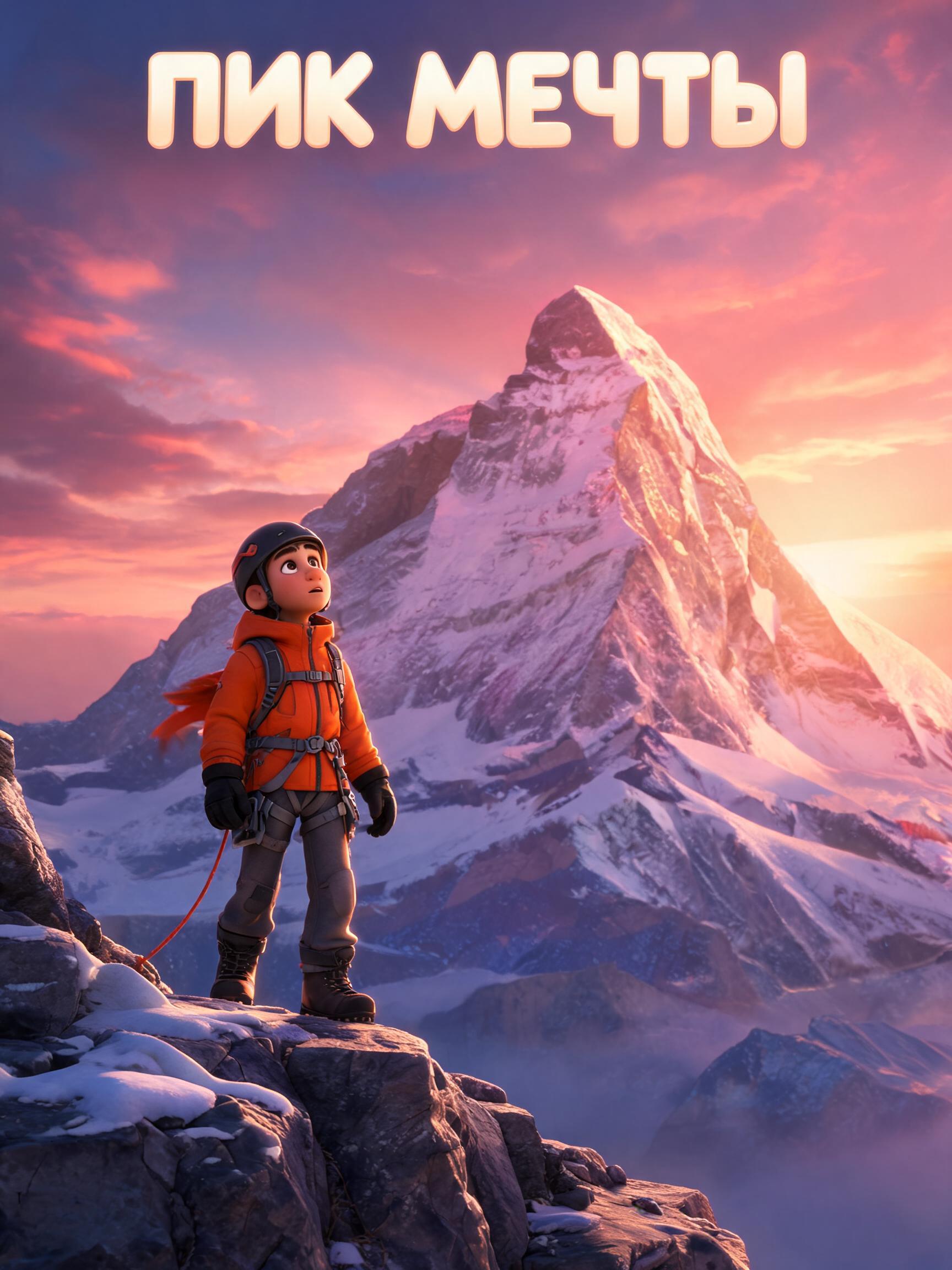 Обложка для сериала 'Пик Мечты'. Молодой альпинист Лео стоит на скалистом уступе и смотрит на величественную, сияющую снежную вершину горы на рассвете. Драматичное небо, кинематографическое освещение. Вверху надпись 'Пик Мечты'. Стиль: 3D-анимация, как у Pixar. Эпичная и вдохновляющая атмосфера.