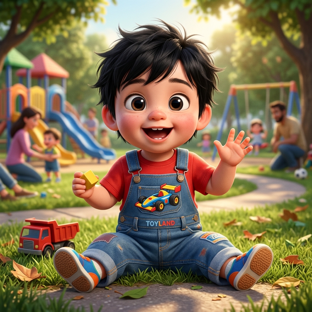 Strong rule: style --- 3D Pixar ---. Мальчик, 1,5 лет, с большими любопытными глазами и взъерошенными короткими черными волосами. Одет в яркую футболку с рисунком машинки и джинсовый комбинезон. Восторженное и счастливое выражение лица. Стиль 3D-анимации Pixar.