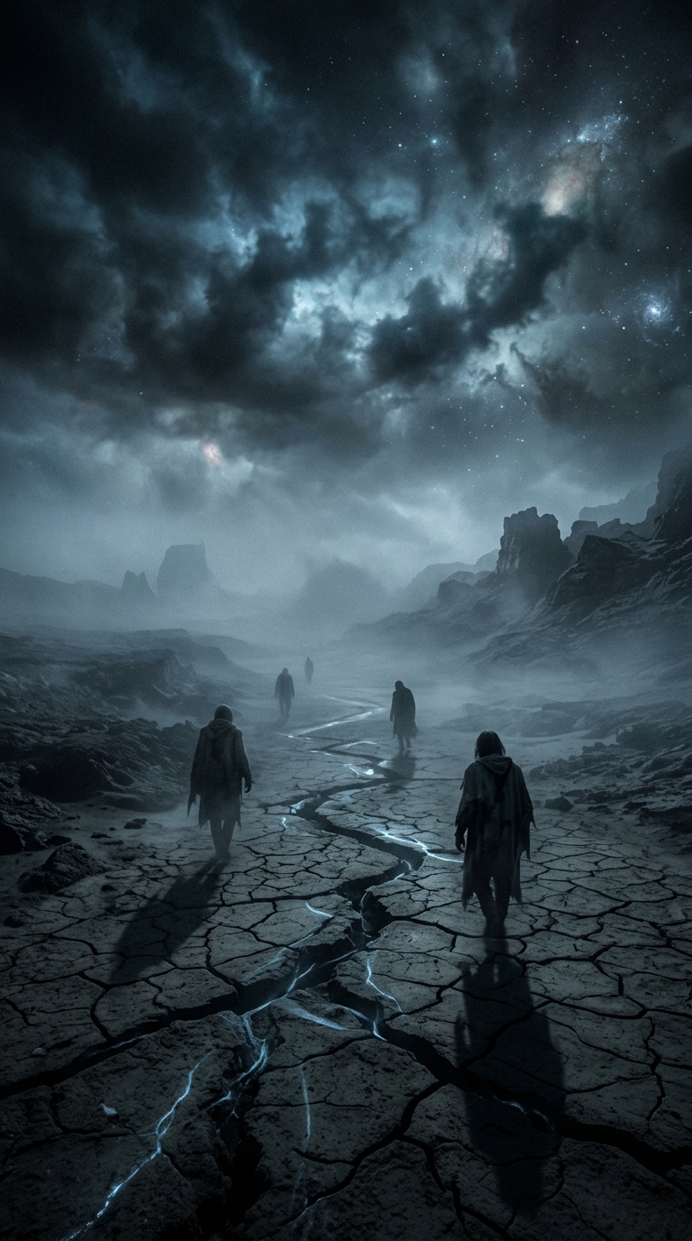 Art style: realistic , cinematic , ethereal , cosmic. Un paisaje desolado y neblinoso donde figuras humanas caminan como sombras, perdidas en un sueño profundo. El suelo está seco y agrietado, y el cielo está cubierto por nubes densas y oscuras. La iluminación es fría y mortecina, con sombras largas y pesadas. La atmósfera es de melancolía y desconexión. La paleta se compone de grises ceniza, azules medianoche y negros profundos. ━━━━━━━━━━━━━━━━━━━━━━━━━━━━━━━━━━━━━━ FINAL STYLE ENFORCEMENT (this is the authoritative rendering directive — it overrides any style wording elsewhere in the prompt): Render this image entirely in " realistic , cinematic , ethereal , cosmic" style. Match the lighting grammar, material response, colour science, level of realism / stylisation, line weight, and shading model typical of " realistic , cinematic , ethereal , cosmic". Keep the subject, composition, camera angle, lighting direction, and colour palette from the description above — but EVERY surface, skin, fabric, material, and environmental element must be rendered in the " realistic , cinematic , ethereal , cosmic" idiom, not in any other medium. Character appearance reference (MUST match exactly): - Madre Tierra: Una mujer etérea y majestuosa que personifica al planeta, con piel que parece hecha de piedra pulida y musgo suave. Su cabello fluye como cascadas de agua cristalina entrelazadas con enredaderas verdes y flores silvestres. Sus ojos brillan con la intensidad de nebulosas distantes, reflejando sabiduría ancestral. Viste una túnica tejida con luz de estrellas y hojas de otoño que cambian de color. Está rodeada por un halo de plantas bioluminiscentes en un entorno onírico. Su energía es maternal, poderosa y serena, bañada por una luz divina que resalta cada detalle de su ser místico y natural.