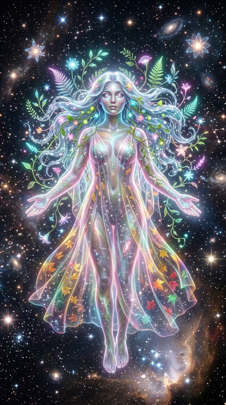Art style: realistic , cinematic , ethereal , cosmic. Una visión onírica de la Madre Tierra en su forma más pura, flotando en un espacio donde las estrellas parecen flores de luz. Su cuerpo es traslúcido y brilla con una luminiscencia interna. El plano es medio, mostrando su rostro sereno y sus manos extendidas. La luz es suave y multidireccional. Paleta de iridiscencia, plata, magenta y cian. ━━━━━━━━━━━━━━━━━━━━━━━━━━━━━━━━━━━━━━ FINAL STYLE ENFORCEMENT (this is the authoritative rendering directive — it overrides any style wording elsewhere in the prompt): Render this image entirely in " realistic , cinematic , ethereal , cosmic" style. Match the lighting grammar, material response, colour science, level of realism / stylisation, line weight, and shading model typical of " realistic , cinematic , ethereal , cosmic". Keep the subject, composition, camera angle, lighting direction, and colour palette from the description above — but EVERY surface, skin, fabric, material, and environmental element must be rendered in the " realistic , cinematic , ethereal , cosmic" idiom, not in any other medium. Character appearance reference (MUST match exactly): - Madre Tierra: Una mujer etérea y majestuosa que personifica al planeta, con piel que parece hecha de piedra pulida y musgo suave. Su cabello fluye como cascadas de agua cristalina entrelazadas con enredaderas verdes y flores silvestres. Sus ojos brillan con la intensidad de nebulosas distantes, reflejando sabiduría ancestral. Viste una túnica tejida con luz de estrellas y hojas de otoño que cambian de color. Está rodeada por un halo de plantas bioluminiscentes en un entorno onírico. Su energía es maternal, poderosa y serena, bañada por una luz divina que resalta cada detalle de su ser místico y natural.