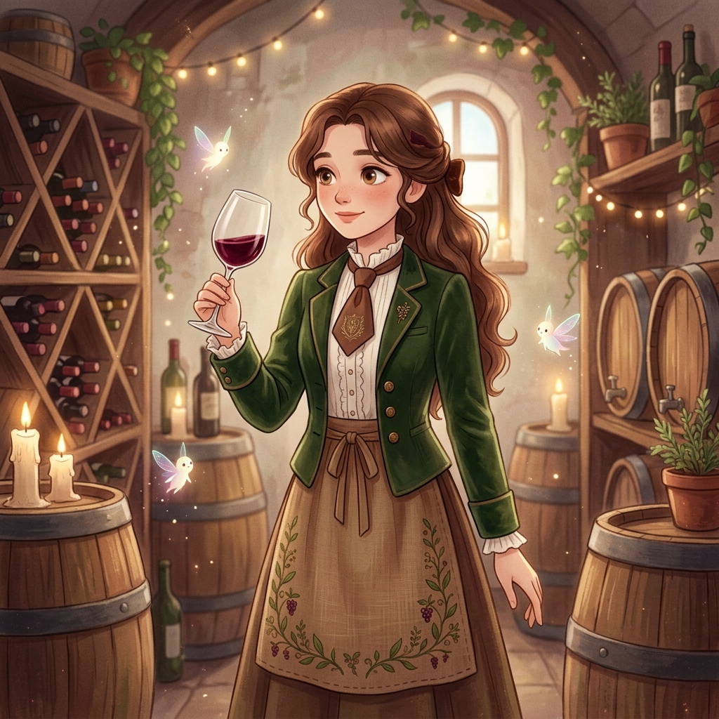 Strong rule: style --- Нежная, волшебная 3D анимация в стиле сказочной... ---. Молодая девушка, лет 20-25, с добрыми, мечтательными карими глазами и длинными каштановыми волосами. Она одета в элегантную форму сомелье с фартуком. Ее образ должен быть мягким и немного сказочным.