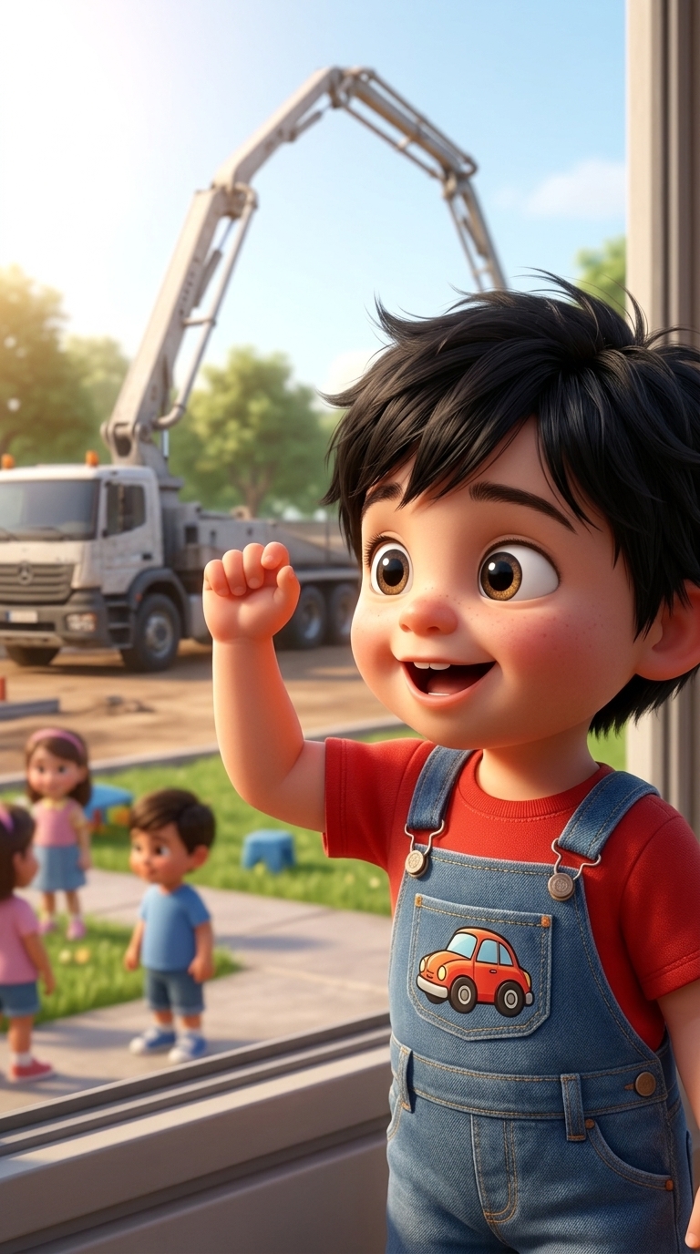 Art style: 3D Pixar. Крупный план на внука, который смотрит на автобетононасос. Он поднимает правую руку, сгибая ее в локте, и с улыбкой имитирует движение стрелы крана. На его лице восторг и сосредоточенность. ━━━━━━━━━━━━━━━━━━━━━━━━━━━━━━━━━━━━━━ FINAL STYLE ENFORCEMENT (this is the authoritative rendering directive — it overrides any style wording elsewhere in the prompt): Render this image entirely in "3D Pixar" style. Match the lighting grammar, material response, colour science, level of realism / stylisation, line weight, and shading model typical of "3D Pixar". Keep the subject, composition, camera angle, lighting direction, and colour palette from the description above — but EVERY surface, skin, fabric, material, and environmental element must be rendered in the "3D Pixar" idiom, not in any other medium. Character appearance reference (MUST match exactly): - Внук: Strong rule: style --- 3D Pixar ---. Мальчик, 1,5 лет, с большими любопытными глазами и взъерошенными короткими черными волосами. Одет в яркую футболку с рисунком машинки и джинсовый комбинезон. Восторженное и счастливое выражение лица. Стиль 3D-анимации Pixar. Reference images context (match the visual style and elements from these): - Про дедушка (character): Пожилой мужчина с усами в синем кардигане и традиционной тюбетейке держит на руках малыша в сером костюме на фоне светлых узорчатых обоев. Портрет выполнен в спокойных тонах и передает атмосферу семейной преемственности и культурных традиций. - Внук (character): Крупный план радостного малыша с бритой головой, одетого в светлую стеганую жилетку поверх полосатой рубашки. Фон представляет собой белую текстурированную занавеску, создавая мягкую и светлую атмосферу.