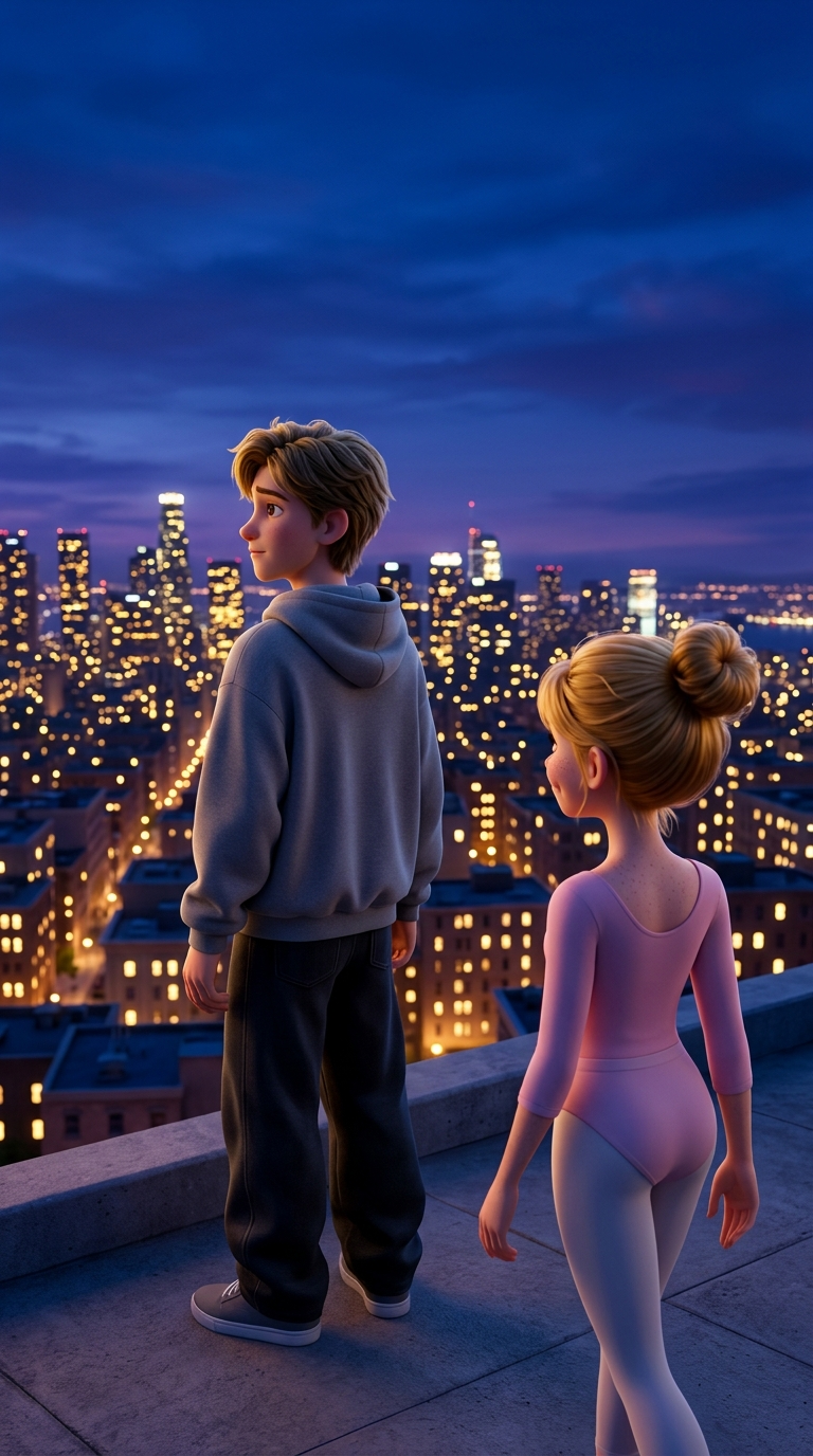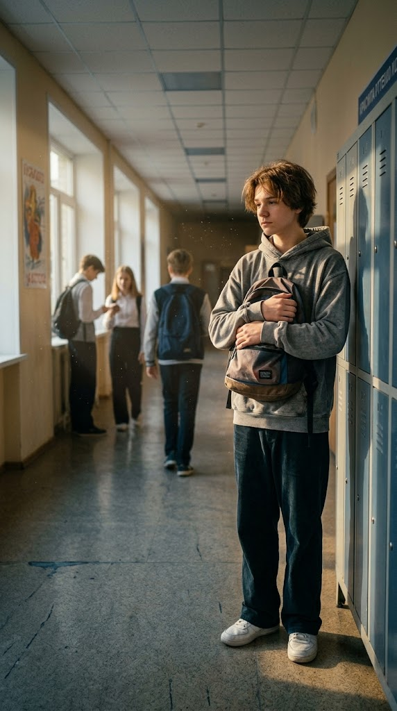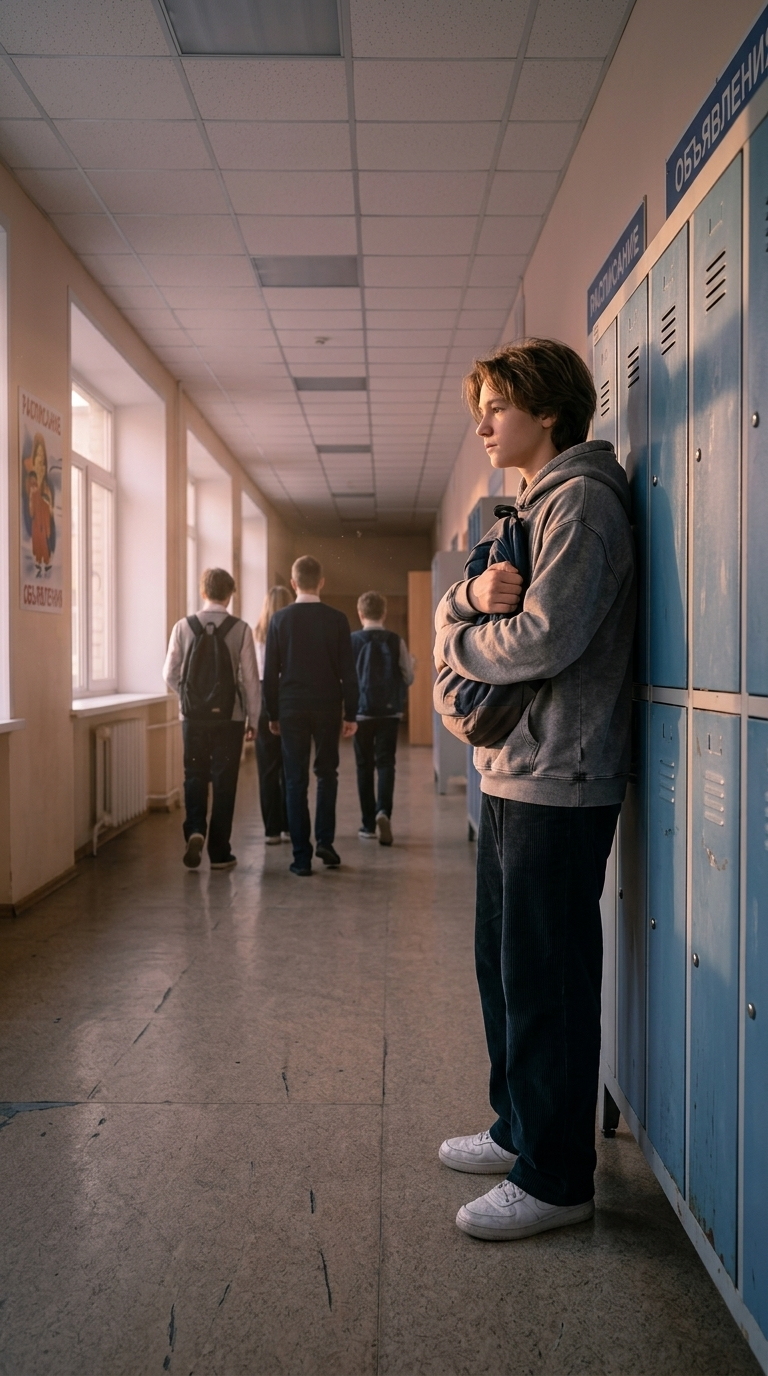 Школьный холл в глубоких вечерних сумерках. Лидия стоит перед своим открытым шкафчиком и держит в руках маленькую записку с прикрепленным к ней нежным полевым цветком. В конце коридора в густой тени виден лишь удаляющийся силуэт Сэма. Цветовая палитра включает сумеречный фиолетовый, индиго и теплый свет, льющийся из приоткрытой двери кабинета. Атмосфера наполнена загадочностью, нежностью и новой надеждой. Камера направлена со спины Лидии, акцентируя внимание на записке в её руках. Character appearance reference (MUST match exactly): - Сэм: Strong rule: style --- Реалистичный кинематографичный стиль ---. Молодой человек лет семнадцати с волевым подбородком и мягкими чертами лица. У него короткие темно-русые волосы и задумчивые серые глаза. Он одет в очень объемное серое худи оверсайз, которое полностью скрывает его широкие плечи и мускулистое телосложение. Его поза расслабленная, но в движениях чувствуется скрытая грация спортсмена. Фон — современный школьный коридор с рядами шкафчиков и мягким дневным светом. Стиль подчеркивает текстуру ткани и детализацию лица, создавая образ скромного, но привлекательного юноши с глубоким внутренним миром. - Лидия: Strong rule: style --- Реалистичный кинематографичный стиль ---. Очаровательная девушка-подросток с длинными, густыми огненно-рыжими волосами, среди которых выделяется одна яркая белоснежная прядь у самого лица. Её глаза разного цвета: левый — глубокий карий, правый — пронзительный изумрудно-зеленый. Она одета в стильную темно-синюю школьную куртку с нашивками и модные аксессуары. На её лице сияет уверенная и открытая улыбка. Фон — залитый солнцем школьный двор с зелеными деревьями. Свет падает сбоку, подчеркивая блеск волос и необычную гетерохромию глаз, создавая образ яркой и незабываемой личности.