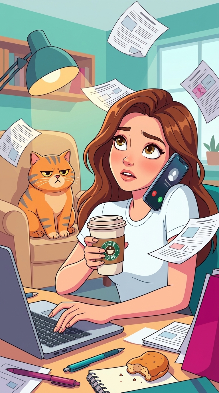 Art style: Modern 2D vector animation, vibrant colors, exp.... Close up of the girl trying to hold a coffee cup, talk on a smartphone, and type at the same time. Papers flying around. The orange cat is in the background with a deeply disappointed, judgmental look. Modern 2D vector animation style. ━━━━━━━━━━━━━━━━━━━━━━━━━━━━━━━━━━━━━━ FINAL STYLE ENFORCEMENT (this is the authoritative rendering directive — it overrides any style wording elsewhere in the prompt): Render this image entirely in "Modern 2D vector animation, vibrant colors, exp..." style. Match the lighting grammar, material response, colour science, level of realism / stylisation, line weight, and shading model typical of "Modern 2D vector animation, vibrant colors, exp...". Keep the subject, composition, camera angle, lighting direction, and colour palette from the description above — but EVERY surface, skin, fabric, material, and environmental element must be rendered in the "Modern 2D vector animation, vibrant colors, exp..." idiom, not in any other medium. Character appearance reference (MUST match exactly): - Девушка: Молодая девушка лет 18-20 в стиле 3D-анимации с овальным лицом, нежной светлой кожей и легким естественным румянцем. У нее густые, длинные волнистые каштановые волосы, объемно уложенные и свободно спадающие на плечи. Большие выразительные глаза орехового цвета с длинными темными ресницами смотрят вверх с мечтательным и любопытным выражением. У нее аккуратный маленький нос и полные губы нежно-персикового оттенка. Девушка стройного телосложения, одета в простую белую облегающую футболку с коротким рукавом. Поза естественная, голова слегка повернута в три четверти, создавая образ юношеской чистоты и вдохновения. - Кот: Упитанный стилизованный серый полосатый кот с круглой мордочкой, пухлыми щеками и большими выразительными золотисто-желтыми глазами. У кота густая мягкая шерсть с темно-серыми полосками и светлым мехом на животе и мордочке. Телосложение плотное и округлое, маленький розовый носик и длинные белые вибриссы. Выражение мордочки сочетает в себе широкое удивление и полное безмятежное спокойствие. Кот лениво развалился, лежа на спине в расслабленной позе с подогнутыми лапами и пушистым хвостом, отведенным в сторону. Reference images context (match the visual style and elements from these): - Молодая девушка с каштановыми волосами (character): Портрет молодой девушки в стиле современной 3D-анимации с длинными волнистыми каштановыми волосами и выразительными зелеными глазами. Она одета в простую белую футболку на однотонном голубом фоне. - Мультяшный серый кот в кресле (character): Обаятельный серый полосатый кот с большими выразительными глазами расслабленно лежит в бежевом мягком кресле на фоне уютной кухни. Изображение выполнено в теплых тонах с высокой детализацией меха и текстур, создавая дружелюбную и комичную атмосферу.