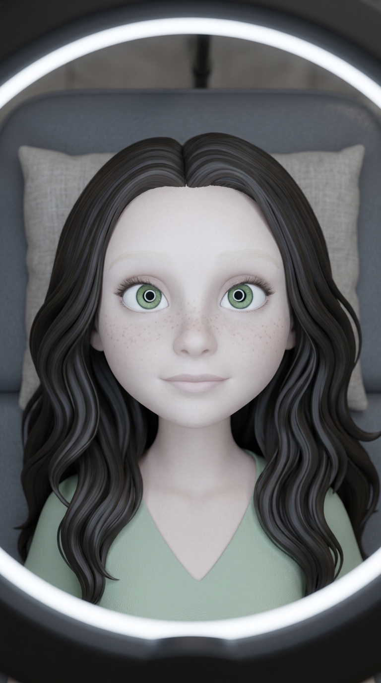 Art style: 3D Pixar. Крупный план лица Анны, лежащей на темно-серой профессиональной кушетке. Ее брови едва заметны, черты лица кажутся бледными под ярким светом кольцевой лампы. Камера направлена сверху вниз, фокусируясь на области глаз. Освещение холодное белое, подчеркивающее отсутствие контраста. Атмосфера спокойная, преобладают нейтральные серые и бежевые тона. ━━━━━━━━━━━━━━━━━━━━━━━━━━━━━━━━━━━━━━ FINAL STYLE ENFORCEMENT (this is the authoritative rendering directive — it overrides any style wording elsewhere in the prompt): Render this image entirely in "3D Pixar" style. Match the lighting grammar, material response, colour science, level of realism / stylisation, line weight, and shading model typical of "3D Pixar". Keep the subject, composition, camera angle, lighting direction, and colour palette from the description above — but EVERY surface, skin, fabric, material, and environmental element must be rendered in the "3D Pixar" idiom, not in any other medium. Character appearance reference (MUST match exactly): - Анна: Молодая девушка в стиле 3D-анимации с сердцевидным лицом, светлой кожей и россыпью веснушек на носу и щеках. У неё длинные, густые темно-каштановые волнистые волосы, разделенные на прямой пробор, и выразительные ярко-зеленые глаза. Она обладает стройным телосложением, одета в простую светло-зеленую футболку с V-образным вырезом. Её выражение лица спокойное и дружелюбное с легкой, приветливой улыбкой, поза фронтальная, взгляд направлен в камеру. Особенностью являются очень светлые, почти незаметные брови, что придает её образу особую мягкость и открытость.