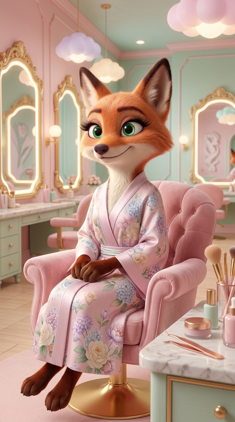 Art style: 3D Pixar, cute anthropomorphic animals, pastel .... 3D animated anthropomorphic elegant red fox with huge glamorous eyelashes, wearing a silk floral robe, sitting in a luxurious pink beauty salon. Soft pastel lighting, elegant mirrors in the background. Pixar 3D style, highly detailed. ━━━━━━━━━━━━━━━━━━━━━━━━━━━━━━━━━━━━━━ FINAL STYLE ENFORCEMENT (this is the authoritative rendering directive — it overrides any style wording elsewhere in the prompt): Render this image entirely in "3D Pixar, cute anthropomorphic animals, pastel ..." style. Match the lighting grammar, material response, colour science, level of realism / stylisation, line weight, and shading model typical of "3D Pixar, cute anthropomorphic animals, pastel ...". Keep the subject, composition, camera angle, lighting direction, and colour palette from the description above — but EVERY surface, skin, fabric, material, and environmental element must be rendered in the "3D Pixar, cute anthropomorphic animals, pastel ..." idiom, not in any other medium. Character appearance reference (MUST match exactly): - Лисичка: Strong rule: style --- 3D Pixar, cute anthropomorphic animals, pastel ... ---. 3D animated anthropomorphic elegant red fox, huge long glamorous eyelashes, bright green eyes, wearing a silk floral robe (pink with flowers), soft fur, Pixar style Reference images context (match the visual style and elements from these): - Luxury Pink Beauty Salon Interior (general): A high-end beauty salon interior in Pixar 3D style, featuring a pastel pink and mint green color palette, soft ambient lighting, elegant decor with gold accents, clean and spacious, highly detailed textures, wide angle view. - Pink Velvet Salon Chair (general): A luxurious pink velvet beauty salon chair with a gold metallic base, Pixar 3D style, soft plush fabric texture, elegant curved design, isolated on a clean white background, highly detailed, square format. - Professional Eyelash Extension Tweezers (general): A pair of professional precision eyelash extension tweezers with a rose gold metallic finish, sleek ergonomic design, Pixar 3D style, isolated on a clean white background, highly detailed, macro shot. - Elegant Ornate Salon Mirror (general): An elegant ornate wall mirror with a gold frame and soft integrated LED backlighting, Pixar 3D style, clean reflective surface, luxury aesthetic, isolated on a neutral background, highly detailed.