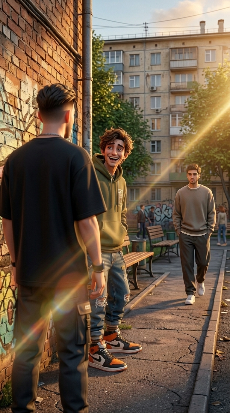 Art style: Cinematic 3D Illustration. Гладкий цифровой худ.... Кадр через плечо Кирилла, футболка кирилла с задней стороны черная. Артем стоит рядом и искренне смеется, глядя в сторону Амира. Солнечный блик попадает в кадр, создавая кинематографичный эффект. Стиль Cinematic 3D Illustration. ━━━━━━━━━━━━━━━━━━━━━━━━━━━━━━━━━━━━━━ FINAL STYLE ENFORCEMENT (this is the authoritative rendering directive — it overrides any style wording elsewhere in the prompt): Render this image entirely in "Cinematic 3D Illustration. Гладкий цифровой худ..." style. Match the lighting grammar, material response, colour science, level of realism / stylisation, line weight, and shading model typical of "Cinematic 3D Illustration. Гладкий цифровой худ...". Keep the subject, composition, camera angle, lighting direction, and colour palette from the description above — but EVERY surface, skin, fabric, material, and environmental element must be rendered in the "Cinematic 3D Illustration. Гладкий цифровой худ..." idiom, not in any other medium. Character appearance reference (MUST match exactly): - Артем: Strong rule: style --- Cinematic 3D Illustration. Гладкий цифровой худ... ---. Молодой парень, 18-20 лет, одет в современную уличную одежду оверсайз: худи, джинсы, кроссовки. У него взъерошенные волосы и живое, выразительное лицо, которое легко переходит от смеха к растерянности. Стиль Cinematic 3D Illustration. - Амир: Strong rule: style --- Cinematic 3D Illustration. Гладкий цифровой худ... ---. Молодой парень, 18-20 лет, . Одет в простую свободную минималистичную, но опрятную одежду. У него спокойное, серьезное лицо с добрыми глазами. Внешний вид отражает внутреннее достоинство и умиротворение. Стиль Cinematic 3D Illustration. - Кирилл: Strong rule: style --- Cinematic 3D Illustration. Гладкий цифровой худ... ---. Ровесник Артема, 18-20 лет. Выглядит более дерзко: стильная стрижка, брендовая футболка оверсайз. На лице постоянно играет самоуверенная ухмылка. Он держит в руках смартфон для съемки видео. Стиль Cinematic 3D Illustration. Brand guidelines: Brand color palette: #79A3C3, #3A2119, #D2E2EC, #EBCDB7, #957662. Use these colors prominently in the composition. Reference images context (match the visual style and elements from these): - локация, место действий (location): кирпичной стена с граффити,. На заднем плане виден многоэтажный жилой дом, скамейки и прохожий в лучах закатного солнца.