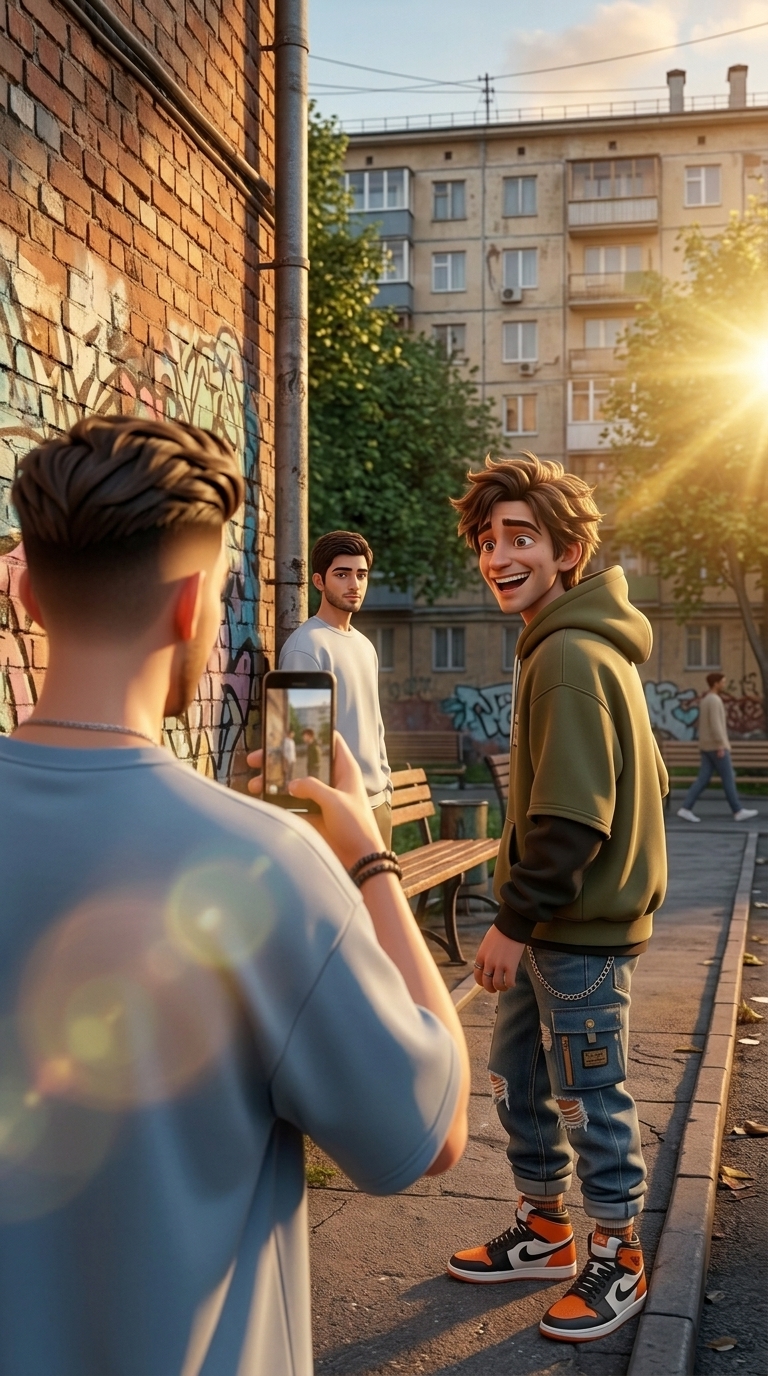 Art style: Cinematic 3D Illustration. Гладкий цифровой худ.... Кадр через плечо Кирилла, Артем стоит рядом и искренне смеется, глядя в сторону Амира. Солнечный блик попадает в кадр, создавая кинематографичный эффект. Стиль Cinematic 3D Illustration. ━━━━━━━━━━━━━━━━━━━━━━━━━━━━━━━━━━━━━━ FINAL STYLE ENFORCEMENT (this is the authoritative rendering directive — it overrides any style wording elsewhere in the prompt): Render this image entirely in "Cinematic 3D Illustration. Гладкий цифровой худ..." style. Match the lighting grammar, material response, colour science, level of realism / stylisation, line weight, and shading model typical of "Cinematic 3D Illustration. Гладкий цифровой худ...". Keep the subject, composition, camera angle, lighting direction, and colour palette from the description above — but EVERY surface, skin, fabric, material, and environmental element must be rendered in the "Cinematic 3D Illustration. Гладкий цифровой худ..." idiom, not in any other medium. Character appearance reference (MUST match exactly): - Артем: Strong rule: style --- Cinematic 3D Illustration. Гладкий цифровой худ... ---. Молодой парень, 18-20 лет, одет в современную уличную одежду оверсайз: худи, джинсы, кроссовки. У него взъерошенные волосы и живое, выразительное лицо, которое легко переходит от смеха к растерянности. Стиль Cinematic 3D Illustration. - Амир: Strong rule: style --- Cinematic 3D Illustration. Гладкий цифровой худ... ---. Молодой парень, 18-20 лет, . Одет в простую свободную минималистичную, но опрятную одежду. У него спокойное, серьезное лицо с добрыми глазами. Внешний вид отражает внутреннее достоинство и умиротворение. Стиль Cinematic 3D Illustration. - Кирилл: Strong rule: style --- Cinematic 3D Illustration. Гладкий цифровой худ... ---. Ровесник Артема, 18-20 лет. Выглядит более дерзко: стильная стрижка, брендовая футболка оверсайз. На лице постоянно играет самоуверенная ухмылка. Он держит в руках смартфон для съемки видео. Стиль Cinematic 3D Illustration. Brand guidelines: Brand color palette: #79A3C3, #3A2119, #D2E2EC, #EBCDB7, #957662. Use these colors prominently in the composition. Reference images context (match the visual style and elements from these): - локация, место действий (location): кирпичной стена с граффити,. На заднем плане виден многоэтажный жилой дом, скамейки и прохожий в лучах закатного солнца.