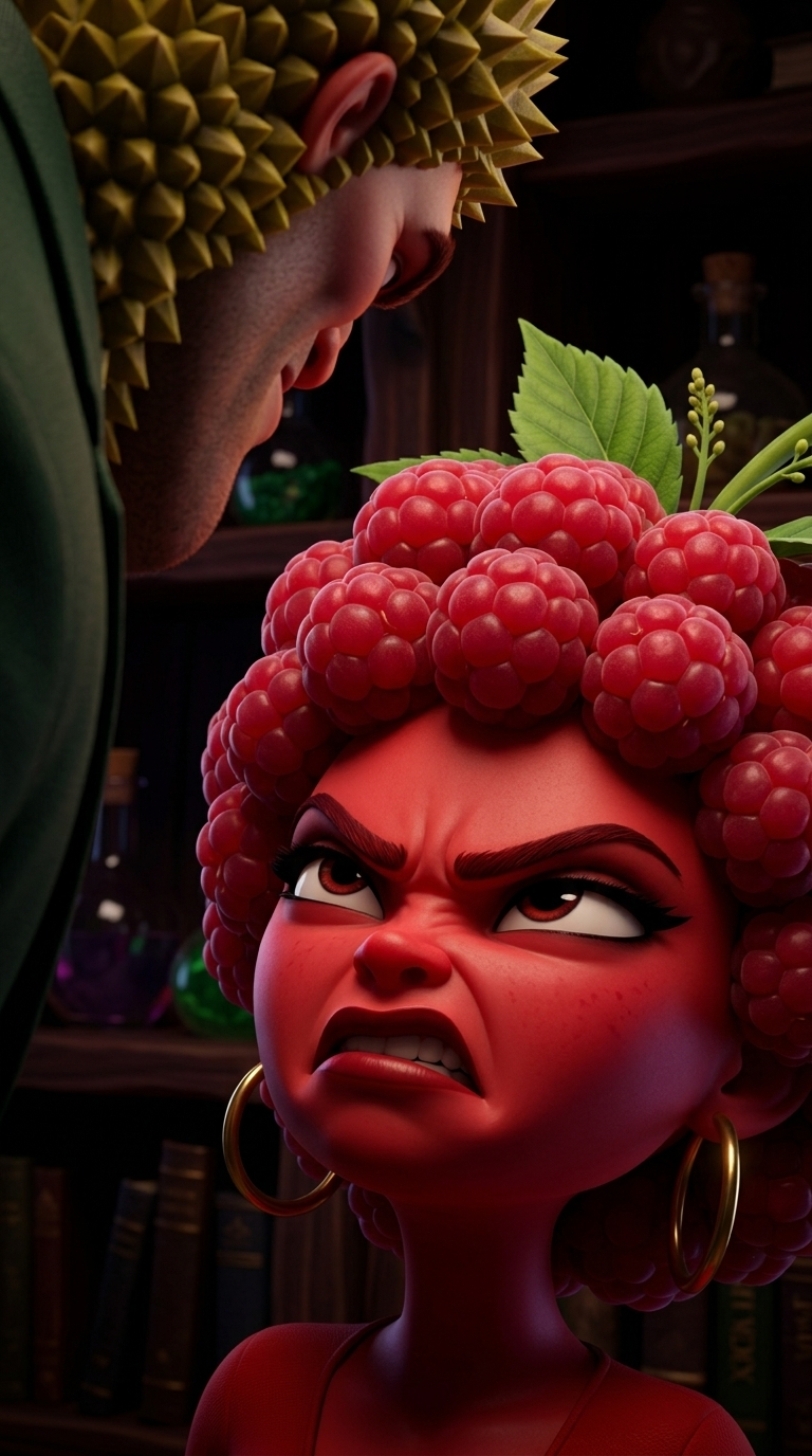 Art style: 3D Animation, Pixar villain style, vibrant colo.... Крупный план лица Малины. Она смотрит снизу вверх на Дуриана с явным отвращением и гневом. Ее красная кожа контрастирует с темным фоном. ━━━━━━━━━━━━━━━━━━━━━━━━━━━━━━━━━━━━━━ FINAL STYLE ENFORCEMENT (this is the authoritative rendering directive — it overrides any style wording elsewhere in the prompt): Render this image entirely in "3D Animation, Pixar villain style, vibrant colo..." style. Match the lighting grammar, material response, colour science, level of realism / stylisation, line weight, and shading model typical of "3D Animation, Pixar villain style, vibrant colo...". Keep the subject, composition, camera angle, lighting direction, and colour palette from the description above — but EVERY surface, skin, fabric, material, and environmental element must be rendered in the "3D Animation, Pixar villain style, vibrant colo..." idiom, not in any other medium. Character appearance reference (MUST match exactly): - Дуриан: Strong rule: style --- 3D Animation, Pixar villain style, vibrant colo... ---. Мужчина крупного телосложения в строгом темно-зеленом костюме и белой рубашке. Его голова, шея и кисти рук покрыты острыми желто-зелеными шипами, как у фрукта дуриан. У него массивный подбородок, злодейская ухмылка и властный взгляд. - Малина: Strong rule: style --- 3D Animation, Pixar villain style, vibrant colo... ---. Стройная девушка с красной кожей. Ее волосы состоят из круглых ягод малины с зелеными листочками на макушке. Одета в облегающий красный топ с глубоким декольте, короткую черную кожаную юбку и черные ботинки. В ушах большие золотые серьги-кольца. Выражение лица дерзкое и злое.