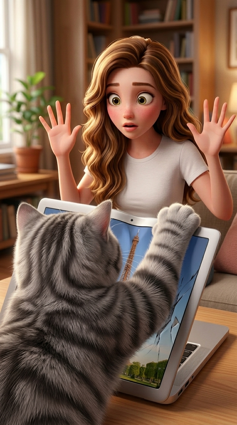 Art style: 3D Pixar Animation. Close up of the chubby grey cat's fluffy paw firmly pressing down and closing the laptop screen. The girl's hands are frozen in surprise in the background. 3D Pixar style. ━━━━━━━━━━━━━━━━━━━━━━━━━━━━━━━━━━━━━━ FINAL STYLE ENFORCEMENT (this is the authoritative rendering directive — it overrides any style wording elsewhere in the prompt): Render this image entirely in "3D Pixar Animation" style. Match the lighting grammar, material response, colour science, level of realism / stylisation, line weight, and shading model typical of "3D Pixar Animation". Keep the subject, composition, camera angle, lighting direction, and colour palette from the description above — but EVERY surface, skin, fabric, material, and environmental element must be rendered in the "3D Pixar Animation" idiom, not in any other medium. Character appearance reference (MUST match exactly): - Девушка: Strong rule: style --- 3D Pixar Animation ---. Молодая девушка лет 20 с сердцевидным лицом, нежной светлой кожей и легким румянцем на щеках. У нее длинные, объемные и волнистые каштановые волосы с золотистыми бликами, спадающие на плечи. Большие, выразительные орехово-зеленые глаза с длинными темными ресницами придают лицу мечтательный вид. У девушки стройное телосложение, она одета в лаконичную белую футболку. Ее поза расслаблена, голова слегка повернута, а взгляд устремлен вверх с выражением любопытства и легкой задумчивости. Черты лица мягкие и гармоничные, выполненные в стиле современной 3D-анимации. - Кот: Обаятельный взрослый кот с округлым телом и густой серой полосатой шерстью. У него очень круглая мордочка с пухлыми щеками, длинными белыми вибриссами и маленьким розовым носом. Огромные, выразительные янтарно-желтые глаза с расширенными зрачками придают ему удивленный и добродушный вид. Кот обладает упитанным телосложением и пушистым животом с белыми подпалинами. Он расслабленно полулежит, откинувшись назад, положив одну переднюю лапу на живот, в то время как задние лапы и длинный полосатый хвост свободно свисают. Его поза выражает абсолютный комфорт и ленивое спокойствие.