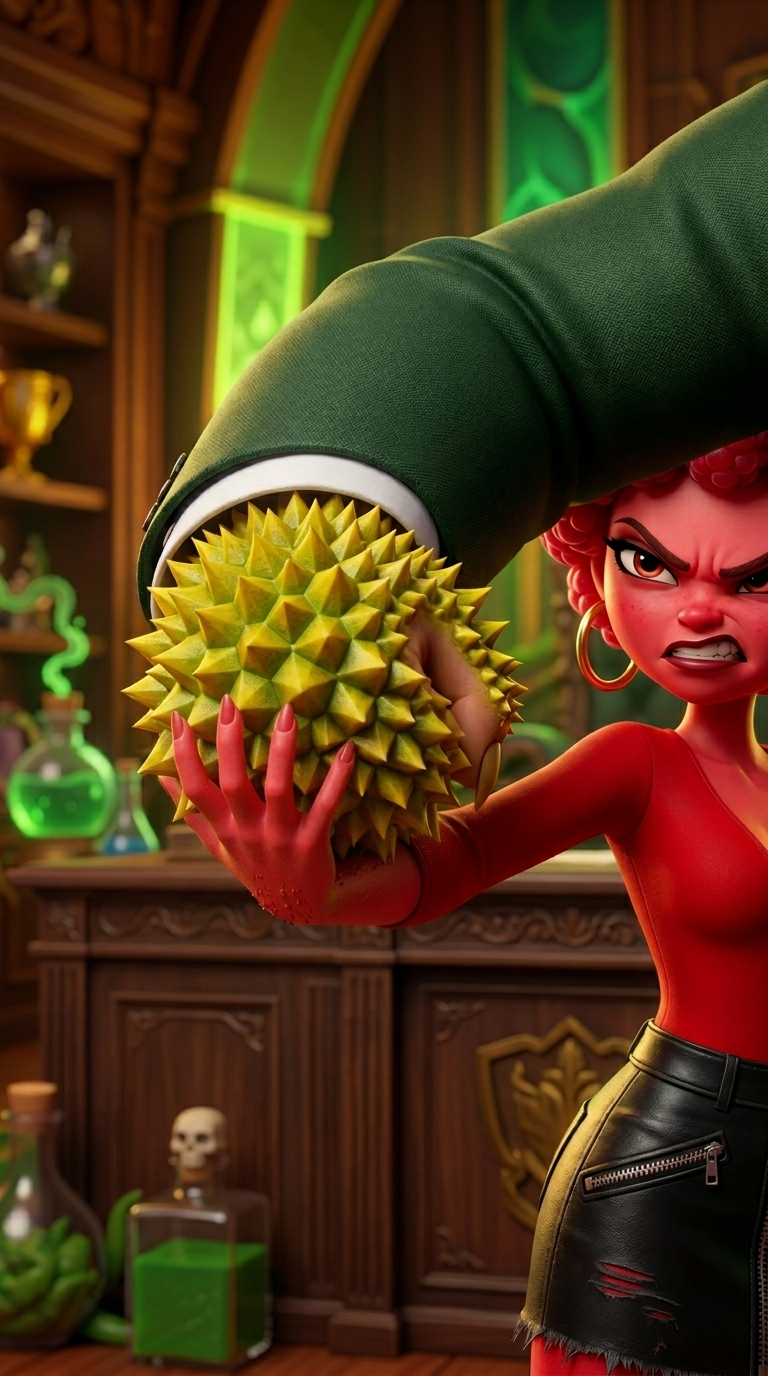 Art style: 3D Animation, Pixar villain style, vibrant colo.... Крупный план шипованной руки Дуриана, которая грубо, но с насмешкой проводит по красной руке Малины. ━━━━━━━━━━━━━━━━━━━━━━━━━━━━━━━━━━━━━━ FINAL STYLE ENFORCEMENT (this is the authoritative rendering directive — it overrides any style wording elsewhere in the prompt): Render this image entirely in "3D Animation, Pixar villain style, vibrant colo..." style. Match the lighting grammar, material response, colour science, level of realism / stylisation, line weight, and shading model typical of "3D Animation, Pixar villain style, vibrant colo...". Keep the subject, composition, camera angle, lighting direction, and colour palette from the description above — but EVERY surface, skin, fabric, material, and environmental element must be rendered in the "3D Animation, Pixar villain style, vibrant colo..." idiom, not in any other medium. Character appearance reference (MUST match exactly): - Дуриан: Strong rule: style --- 3D Animation, Pixar villain style, vibrant colo... ---. Мужчина крупного телосложения в строгом темно-зеленом костюме и белой рубашке. Его голова, шея и кисти рук покрыты острыми желто-зелеными шипами, как у фрукта дуриан. У него массивный подбородок, злодейская ухмылка и властный взгляд. - Малина: Strong rule: style --- 3D Animation, Pixar villain style, vibrant colo... ---. Стройная девушка с красной кожей. Ее волосы состоят из круглых ягод малины с зелеными листочками на макушке. Одета в облегающий красный топ с глубоким декольте, короткую черную кожаную юбку и черные ботинки. В ушах большие золотые серьги-кольца. Выражение лица дерзкое и злое.