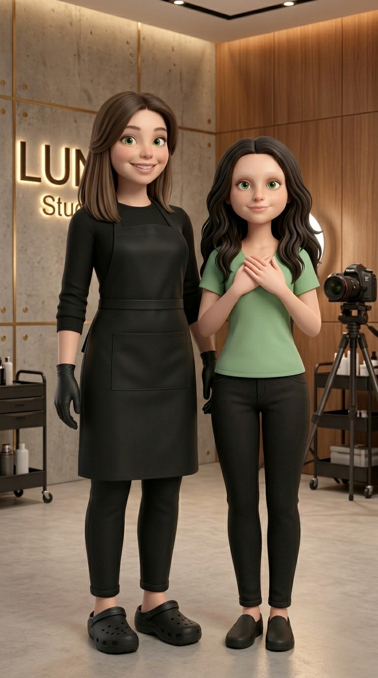 Art style: 3D Pixar. Финальная сцена в студии. Анна стоит рядом с Екатериной, они обе улыбаются и смотрят в камеру. Анна жестикулирует, выражая благодарность. На заднем плане виден стильный интерьер студии «ЛУНА» и кольцевая лампа. Освещение мягкое, заполняющее. Палитра теплая и дружелюбная, создающая ощущение завершенности и успеха. ━━━━━━━━━━━━━━━━━━━━━━━━━━━━━━━━━━━━━━ FINAL STYLE ENFORCEMENT (this is the authoritative rendering directive — it overrides any style wording elsewhere in the prompt): Render this image entirely in "3D Pixar" style. Match the lighting grammar, material response, colour science, level of realism / stylisation, line weight, and shading model typical of "3D Pixar". Keep the subject, composition, camera angle, lighting direction, and colour palette from the description above — but EVERY surface, skin, fabric, material, and environmental element must be rendered in the "3D Pixar" idiom, not in any other medium. Character appearance reference (MUST match exactly): - Екатерина: Молодая женщина в стиле 3D-анимации, около 20-25 лет, с овальным лицом, светлой кожей и большими зелеными глазами. У нее каштановые волосы средней длины, уложенные мягкими волнами и разделенные на боковой пробор. Она стройного телосложения, одета в полностью черный рабочий костюм: лонгслив, длинный фартук с накладным карманом, узкие брюки и черные сабо. На обеих руках надеты черные нитриловые перчатки. У персонажа доброжелательное выражение лица с легкой улыбкой, она стоит в полный рост и приветливо машет правой рукой. - Анна: Молодая девушка в стиле 3D-анимации с сердцевидным лицом, светлой кожей и россыпью веснушек на носу и щеках. У неё длинные, густые темно-каштановые волнистые волосы, разделенные на прямой пробор, и выразительные ярко-зеленые глаза. Она обладает стройным телосложением, одета в простую светло-зеленую футболку с V-образным вырезом. Её выражение лица спокойное и дружелюбное с легкой, приветливой улыбкой, поза фронтальная, взгляд направлен в камеру. Особенностью являются очень светлые, почти незаметные брови, что придает её образу особую мягкость и открытость.