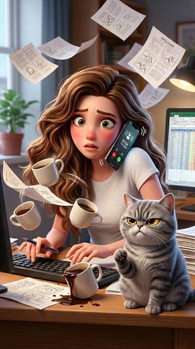 Art style: 3D Pixar Animation. The same young woman juggling a coffee cup, a ringing smartphone by her ear, and trying to type with one hand. Papers are flying. The grey cat sits on the edge of the desk, looking at her with a highly judgmental, unimpressed expression. 3D Pixar style. ━━━━━━━━━━━━━━━━━━━━━━━━━━━━━━━━━━━━━━ FINAL STYLE ENFORCEMENT (this is the authoritative rendering directive — it overrides any style wording elsewhere in the prompt): Render this image entirely in "3D Pixar Animation" style. Match the lighting grammar, material response, colour science, level of realism / stylisation, line weight, and shading model typical of "3D Pixar Animation". Keep the subject, composition, camera angle, lighting direction, and colour palette from the description above — but EVERY surface, skin, fabric, material, and environmental element must be rendered in the "3D Pixar Animation" idiom, not in any other medium. Character appearance reference (MUST match exactly): - Девушка: Strong rule: style --- 3D Pixar Animation ---. Молодая девушка лет 20 с сердцевидным лицом, нежной светлой кожей и легким румянцем на щеках. У нее длинные, объемные и волнистые каштановые волосы с золотистыми бликами, спадающие на плечи. Большие, выразительные орехово-зеленые глаза с длинными темными ресницами придают лицу мечтательный вид. У девушки стройное телосложение, она одета в лаконичную белую футболку. Ее поза расслаблена, голова слегка повернута, а взгляд устремлен вверх с выражением любопытства и легкой задумчивости. Черты лица мягкие и гармоничные, выполненные в стиле современной 3D-анимации. - Кот: Обаятельный взрослый кот с округлым телом и густой серой полосатой шерстью. У него очень круглая мордочка с пухлыми щеками, длинными белыми вибриссами и маленьким розовым носом. Огромные, выразительные янтарно-желтые глаза с расширенными зрачками придают ему удивленный и добродушный вид. Кот обладает упитанным телосложением и пушистым животом с белыми подпалинами. Он расслабленно полулежит, откинувшись назад, положив одну переднюю лапу на живот, в то время как задние лапы и длинный полосатый хвост свободно свисают. Его поза выражает абсолютный комфорт и ленивое спокойствие.