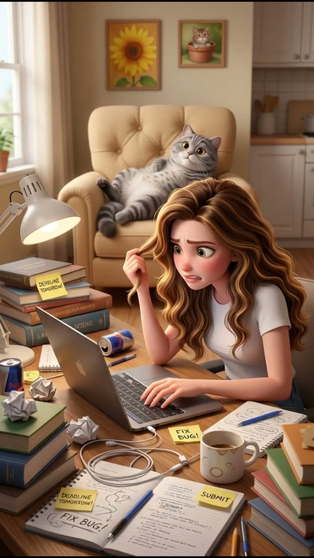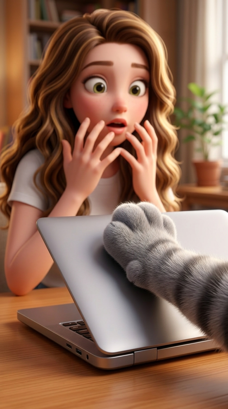Art style: 3D Pixar Animation. Close up of the chubby grey cat's fluffy paw firmly pressing down and closing the laptop screen. The girl's hands are frozen in surprise in the background. 3D Pixar style. ━━━━━━━━━━━━━━━━━━━━━━━━━━━━━━━━━━━━━━ FINAL STYLE ENFORCEMENT (this is the authoritative rendering directive — it overrides any style wording elsewhere in the prompt): Render this image entirely in "3D Pixar Animation" style. Match the lighting grammar, material response, colour science, level of realism / stylisation, line weight, and shading model typical of "3D Pixar Animation". Keep the subject, composition, camera angle, lighting direction, and colour palette from the description above — but EVERY surface, skin, fabric, material, and environmental element must be rendered in the "3D Pixar Animation" idiom, not in any other medium. Character appearance reference (MUST match exactly): - Девушка: Strong rule: style --- 3D Pixar Animation ---. Молодая девушка лет 20 с сердцевидным лицом, нежной светлой кожей и легким румянцем на щеках. У нее длинные, объемные и волнистые каштановые волосы с золотистыми бликами, спадающие на плечи. Большие, выразительные орехово-зеленые глаза с длинными темными ресницами придают лицу мечтательный вид. У девушки стройное телосложение, она одета в лаконичную белую футболку. Ее поза расслаблена, голова слегка повернута, а взгляд устремлен вверх с выражением любопытства и легкой задумчивости. Черты лица мягкие и гармоничные, выполненные в стиле современной 3D-анимации. - Кот: Обаятельный взрослый кот с округлым телом и густой серой полосатой шерстью. У него очень круглая мордочка с пухлыми щеками, длинными белыми вибриссами и маленьким розовым носом. Огромные, выразительные янтарно-желтые глаза с расширенными зрачками придают ему удивленный и добродушный вид. Кот обладает упитанным телосложением и пушистым животом с белыми подпалинами. Он расслабленно полулежит, откинувшись назад, положив одну переднюю лапу на живот, в то время как задние лапы и длинный полосатый хвост свободно свисают. Его поза выражает абсолютный комфорт и ленивое спокойствие.