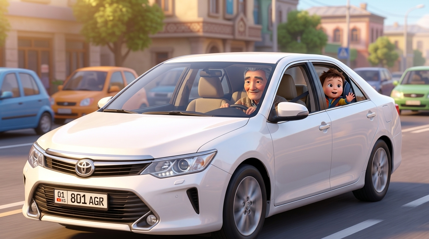 Art style: 3D Pixar. Солнечный день. Белая Toyota Camry 55 с госномером 01KG 801 AGR едет по городской улице. Внутри машины сидят Дедушка за рулем и Внук в детском кресле сзади, с интересом смотрящий в окно. Мягкий солнечный свет, яркие цвета. Стиль 3D анимации Pixar. ━━━━━━━━━━━━━━━━━━━━━━━━━━━━━━━━━━━━━━ FINAL STYLE ENFORCEMENT (this is the authoritative rendering directive — it overrides any style wording elsewhere in the prompt): Render this image entirely in "3D Pixar" style. Match the lighting grammar, material response, colour science, level of realism / stylisation, line weight, and shading model typical of "3D Pixar". Keep the subject, composition, camera angle, lighting direction, and colour palette from the description above — but EVERY surface, skin, fabric, material, and environmental element must be rendered in the "3D Pixar" idiom, not in any other medium. Character appearance reference (MUST match exactly): - Дедушка: Пожилой мужчина, лет 65, с добрыми морщинками вокруг глаз. Седые, аккуратно причесанные волосы. Одет в уютный свитер и брюки. На лице теплая, любящая улыбка. Стиль Pixar, мягкие черты лица. - Внук: Мальчик 5-6 лет с большими, любопытными глазами и растрепанными каштановыми волосами. Одет в яркую курточку, джинсы и кроссовки. Выражение лица полно восторга и удивления. Стиль Pixar, круглые щечки. Reference images context (match the visual style and elements from these): - Внук (character): Маленький мальчик с короткой стрижкой радостно улыбается, сидя на фоне подушки с коричневым узором. Он одет в коричневую кофту и полосатый стеганый жилет, создавая теплую и уютную атмосферу. - Продедушка (character): Портрет пожилого мужчины с усами в синем кардигане и тюбетейке, держащего на руках маленького ребенка в сером костюме и зеленой шапочке. Фон представляет собой светлые обои с классическим узором, создавая атмосферу семейного портрета.