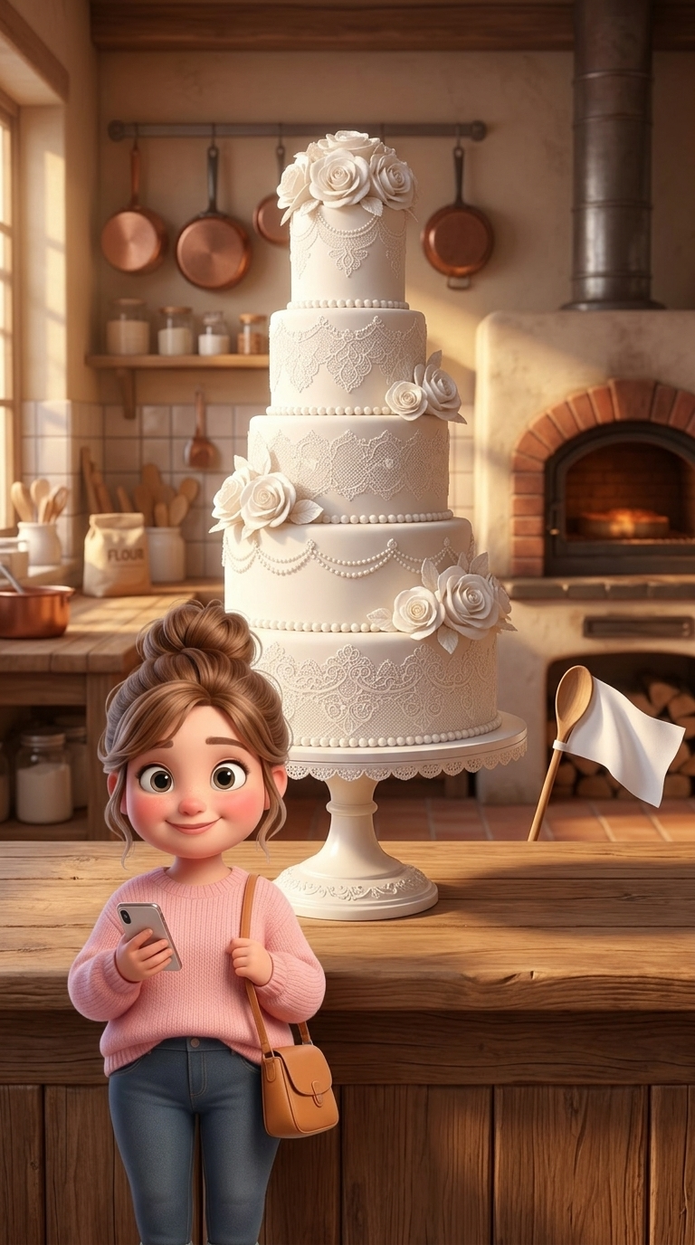 Art style: 3D Pixar. A warm golden-lit bakery kitchen at dawn. A magnificent 5-tier white cake with delicate white roses, pearl border details and elegant lace fondant patterns on each tier sits perfectly centered on a white cake stand on the counter. Standing in front of it is a young woman customer with light brown hair in a loose messy bun with strands falling on her face, big round innocent eyes, rosy cheeks, wearing a cozy pastel pink sweater, holding her phone typing cheerfully. Her expression is wide-eyed, delighted and completely oblivious. Behind the counter on the right side, a single white cloth is being waved slowly on a wooden spoon — like a surrender flag — just barely visible above the counter edge. No body visible, just the white flag waving. No other cakes visible. Cozy kitchen background only. 3D Pixar-style animation, warm golden dawn lighting, soft shadows, wide shot. ━━━━━━━━━━━━━━━━━━━━━━━━━━━━━━━━━━━━━━ FINAL STYLE ENFORCEMENT (this is the authoritative rendering directive — it overrides any style wording elsewhere in the prompt): Render this image entirely in "3D Pixar" style. Match the lighting grammar, material response, colour science, level of realism / stylisation, line weight, and shading model typical of "3D Pixar". Keep the subject, composition, camera angle, lighting direction, and colour palette from the description above — but EVERY surface, skin, fabric, material, and environmental element must be rendered in the "3D Pixar" idiom, not in any other medium.