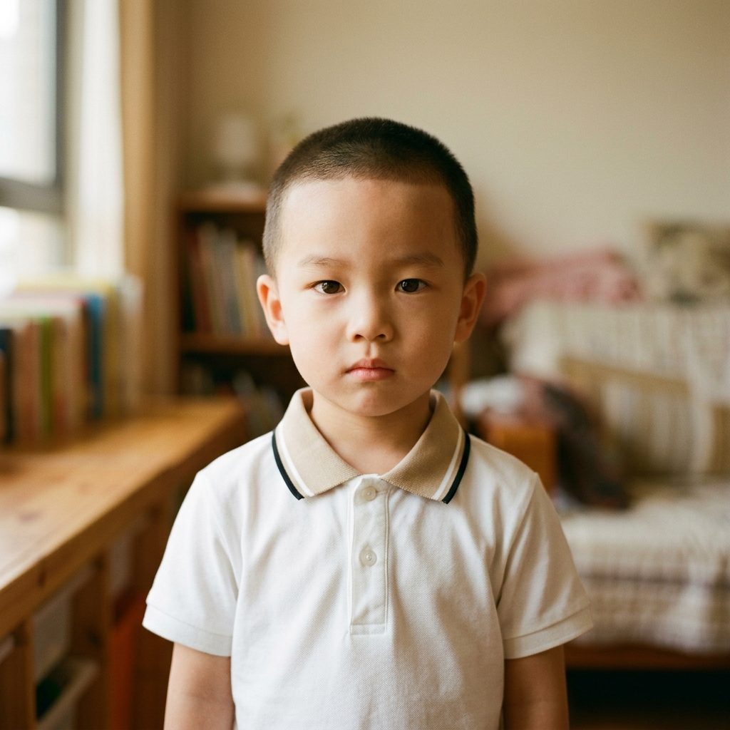 Strong rule: style --- Кинематографический, реалистичный, с теплой цве... ---. Маленький мальчик примерно 3-5 лет с круглым лицом и светлой кожей. У него очень короткая стрижка «ёжик», волосы темного цвета. Глаза темно-карие, миндалевидной формы, взгляд серьезный и сосредоточенный. Нос небольшой, губы плотно сжаты в нейтральном выражении. Мальчик одет в белую футболку-поло с бежевым воротником, украшенным черными и белыми полосками. Поза фронтальная, плечи расправлены, он смотрит прямо в камеру. Телосложение детское, хрупкое.