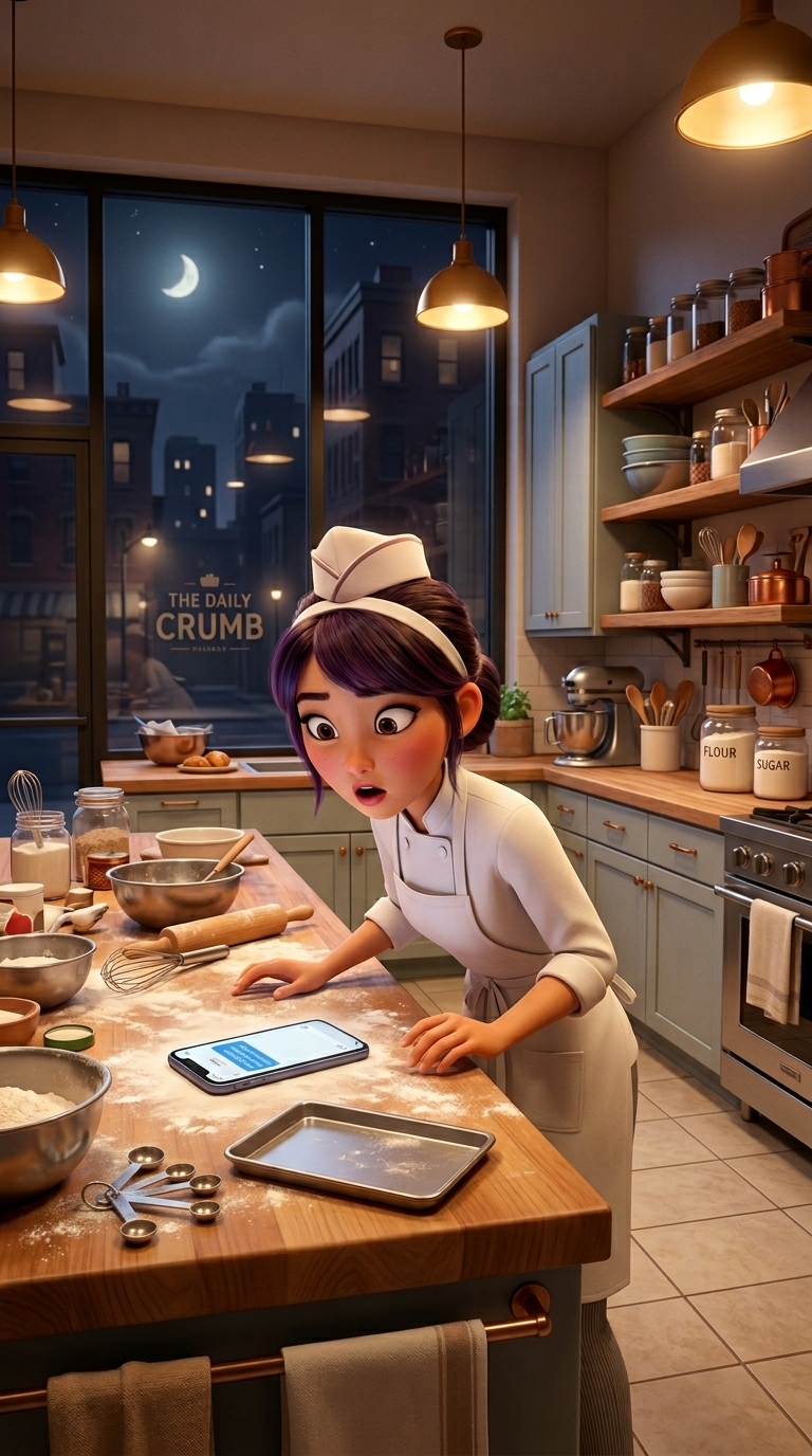 Art style: 3D Pixar. A modern bright bakery kitchen at night. Large floor-to-ceiling windows showing a dark quiet city outside, pale moonlight coming through. Light grey-blue cabinets, wooden countertops dusted with flour, open wooden shelves with glass jars and mixing bowls, scattered baking tools. A young Central Asian woman baker with dark brown hair and subtle purple-tinted bangs worn half-up, almond-shaped warm brown eyes, rosy pink lips, light warm skin tone, wearing a white baker's uniform with a white apron and a small tilted chef's hat — leaning over the counter, eyes wide open in shock, mouth slightly open, staring at a glowing smartphone on the counter in front of her. The phone screen clearly shows a message reading "I need a 5-tier cake by tomorrow morning." No croissants, no bread, no stone oven. 3D Pixar-style animation, warm golden interior lighting contrasting with dark night outside, wide shot, cozy modern bakery atmosphere. ━━━━━━━━━━━━━━━━━━━━━━━━━━━━━━━━━━━━━━ FINAL STYLE ENFORCEMENT (this is the authoritative rendering directive — it overrides any style wording elsewhere in the prompt): Render this image entirely in "3D Pixar" style. Match the lighting grammar, material response, colour science, level of realism / stylisation, line weight, and shading model typical of "3D Pixar". Keep the subject, composition, camera angle, lighting direction, and colour palette from the description above — but EVERY surface, skin, fabric, material, and environmental element must be rendered in the "3D Pixar" idiom, not in any other medium.