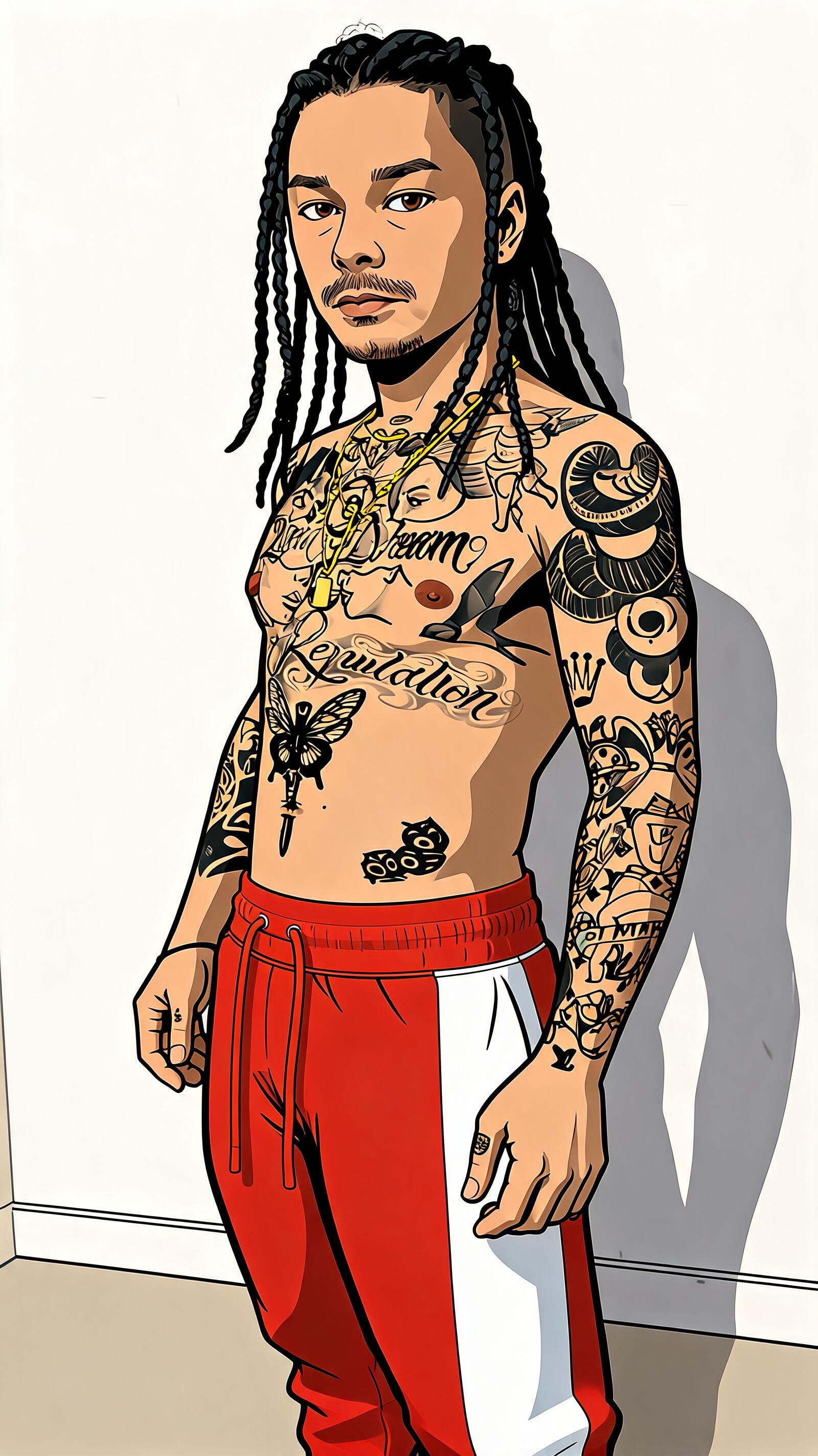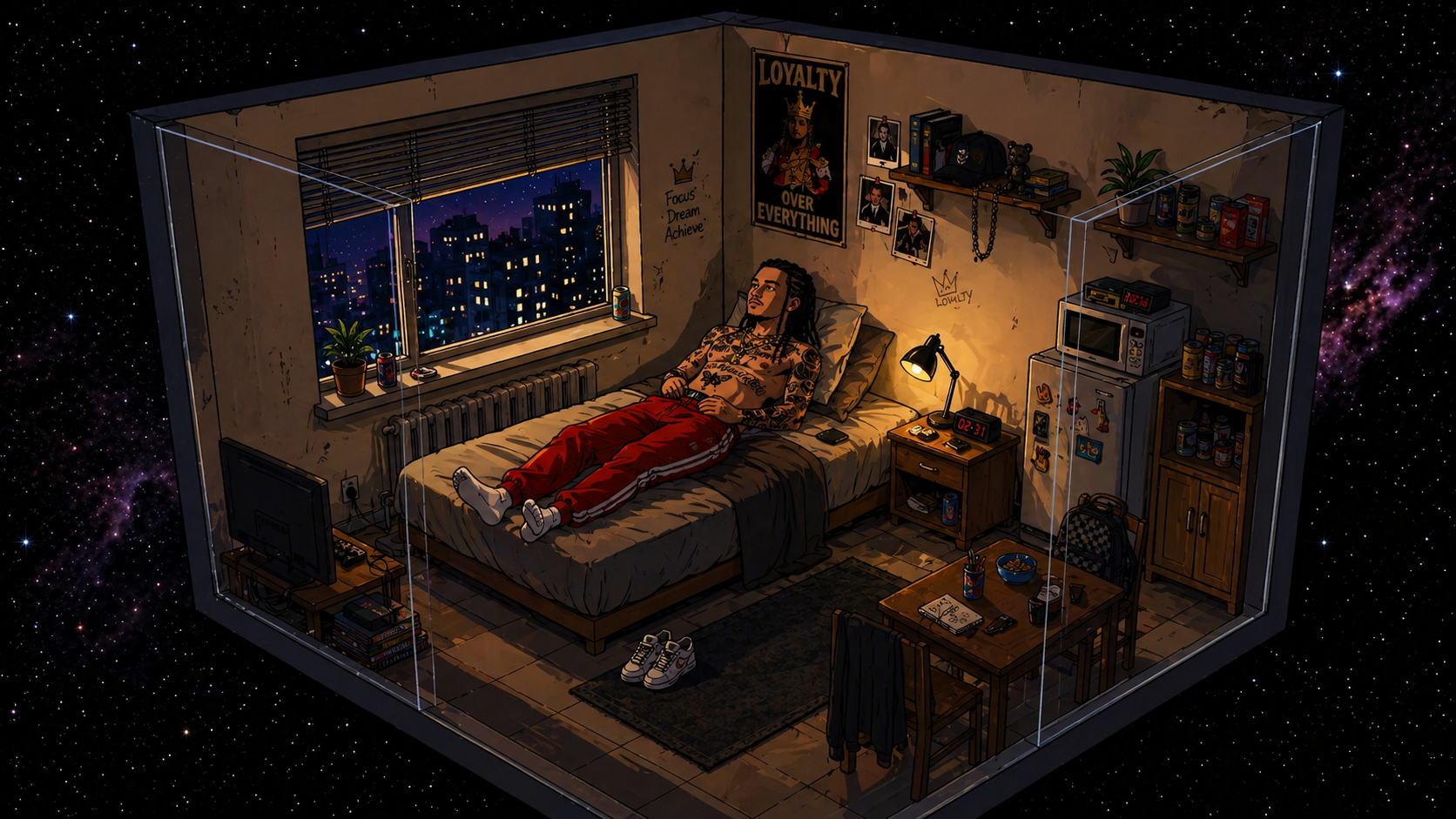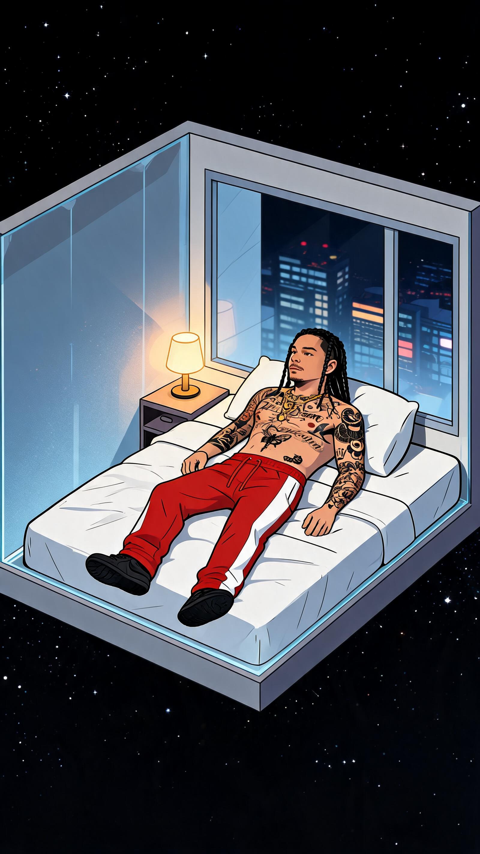 Same character from the reference image, preserving the exact face and facial features, with long black braids, identical tattoos in placement and design, and maintaining the same proportions without distortion. The scene is an isometric cutaway of a small apartment floating in deep space, with two walls partially transparent like a glass box, rendered in a clean cartoon animation style. The environment includes a simple bed with a pillow and blanket, a small bedside table with a warm lamp, a window showing stylized city lights at night, minimal furniture creating a cozy yet simple atmosphere. The character is lying on the bed in a relaxed position with arms resting naturally, looking toward the window. The style is high-quality cartoon animation featuring smooth shapes, soft shading, and simplified details, with no realistic textures, noise, or grain. The lighting inside the room is warm and soft, while the space outside features cool blue tones with soft shadows. The composition is a wide shot, fully capturing the entire room and character clearly, with a color palette that is balanced, clean, slightly vibrant, but natural.