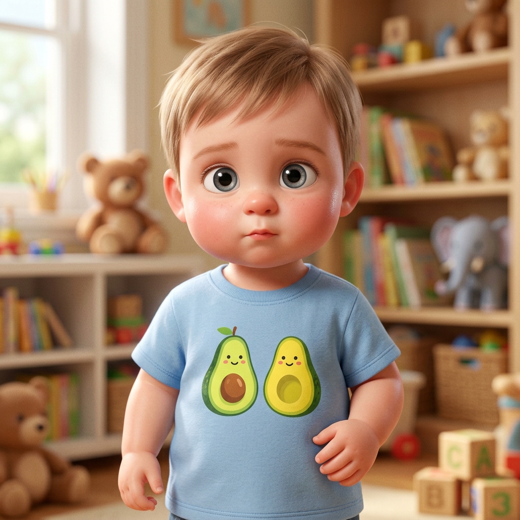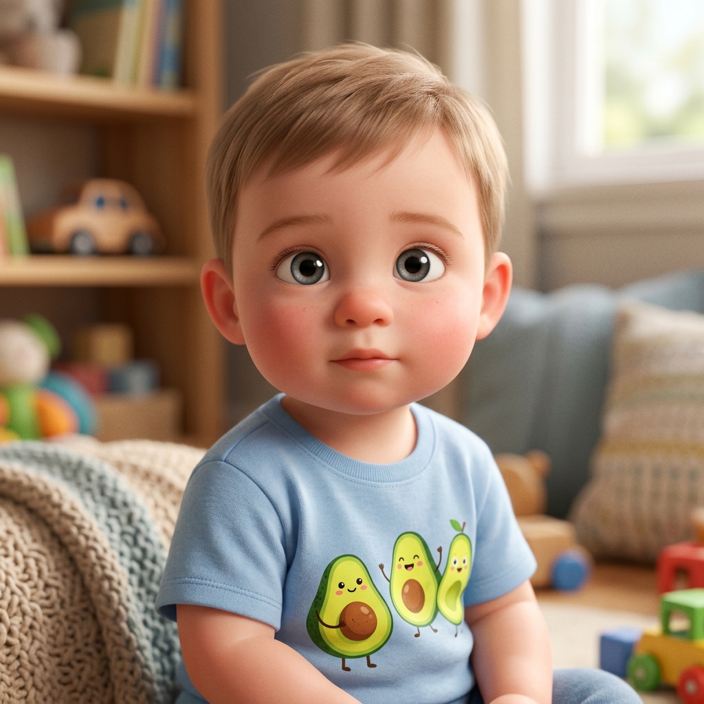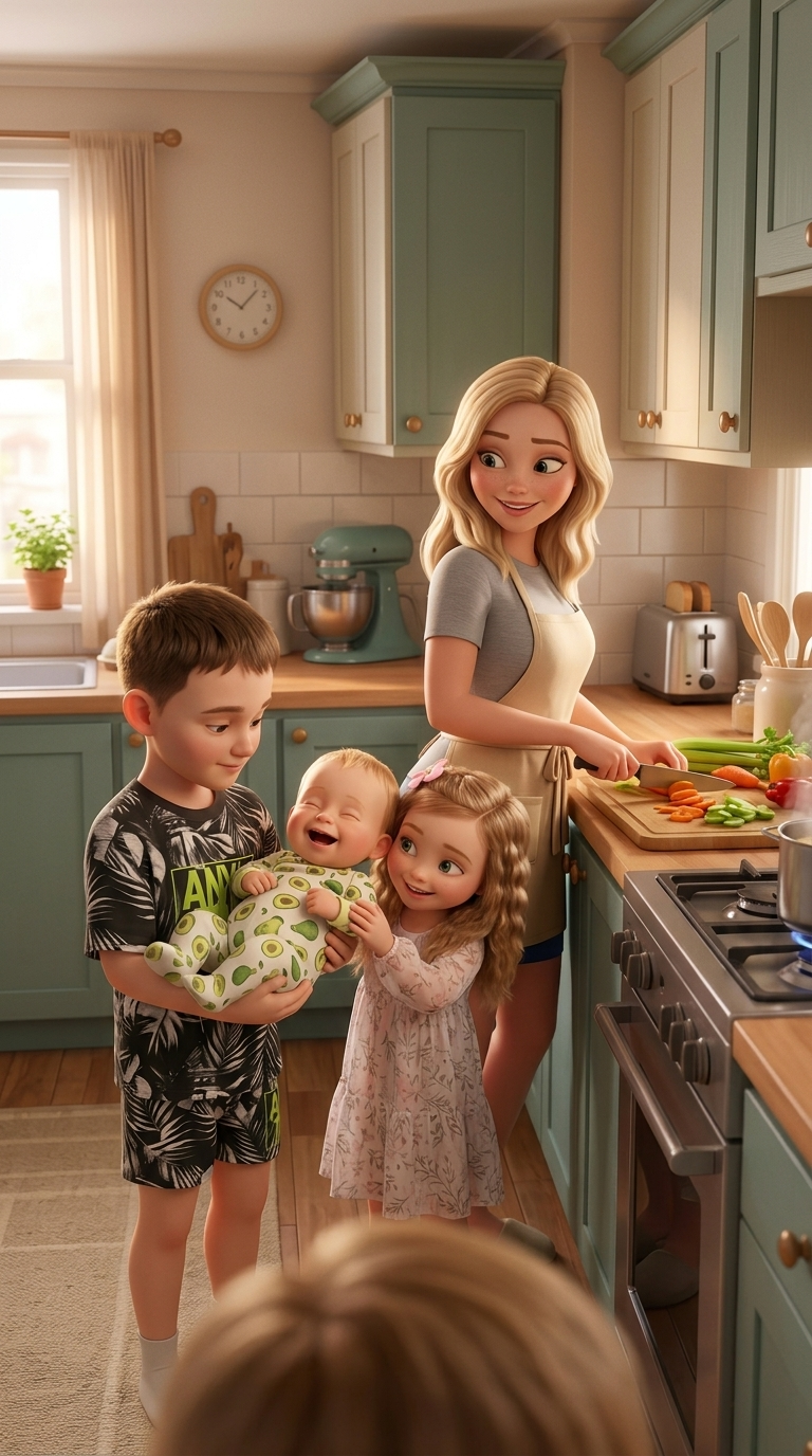 Art style: 3D Pixar. Мама оборачивается к детям от плиты, вытирая руки о фартук. Лева и Аня поднимают головы от игры, а Демид радостно тянет к ним ручки. ━━━━━━━━━━━━━━━━━━━━━━━━━━━━━━━━━━━━━━ FINAL STYLE ENFORCEMENT (this is the authoritative rendering directive — it overrides any style wording elsewhere in the prompt): Render this image entirely in "3D Pixar" style. Match the lighting grammar, material response, colour science, level of realism / stylisation, line weight, and shading model typical of "3D Pixar". Keep the subject, composition, camera angle, lighting direction, and colour palette from the description above — but EVERY surface, skin, fabric, material, and environmental element must be rendered in the "3D Pixar" idiom, not in any other medium. Character appearance reference (MUST match exactly): - Мама: Молодая женщина лет двадцати с овальным лицом и светлой кожей. У неё длинные волнистые светлые волосы с пробором посередине и большие выразительные зеленые глаза. У неё стройное телосложение и мягкая, дружелюбная улыбка. Она одета в серую футболку, синие облегающие шорты и бежевый кухонный фартук, завязанный на талии. Персонаж изображен в стиле современной 3D-анимации, стоит вполоборота, держась за ручку сковороды и помешивая еду деревянной ложкой. - Лева: Мальчик примерно 6 лет с круглым лицом и светлой кожей. У него короткие каштановые волосы, аккуратно уложенные, и большие выразительные карие глаза. У него стройное телосложение, он одет в черную футболку и подходящие шорты с белым тропическим принтом из листьев и надписью «ANYTIME» ярко-неонового зеленого цвета. Он стоит в расслабленной позе с легкой, любопытной улыбкой на лице. - Аня: Маленькая девочка около 5 лет с круглым лицом и светлой кожей в стиле 3D-анимации. У нее длинные волнистые светло-каштановые волосы, украшенные розовой заколкой-цветком сбоку. Глаза большие, выразительные, зеленого цвета. Она одета в нежное белое платье с длинными рукавами и тонким растительным узором из полупрозрачной ткани. У нее милое, кроткое выражение лица с легкой улыбкой, голова слегка наклонена в сторону, телосложение хрупкое и детское. - Демид: Очаровательный младенец мужского пола примерно одного года с круглым лицом и пухлыми щечками. У него светлая, гладкая кожа и короткие, тонкие светлые волосы, уложенные в легком беспорядке. Огромные выразительные глаза серо-зеленого цвета с длинными ресницами смотрят с любопытством. На кончике маленького носа заметна крошечная родинка. Малыш одет в белую пижаму с ярким принтом в виде половинок авокадо. Он полулежит в расслабленной позе с легкой, невинной улыбкой на губах, создавая образ персонажа современной 3D-анимации.