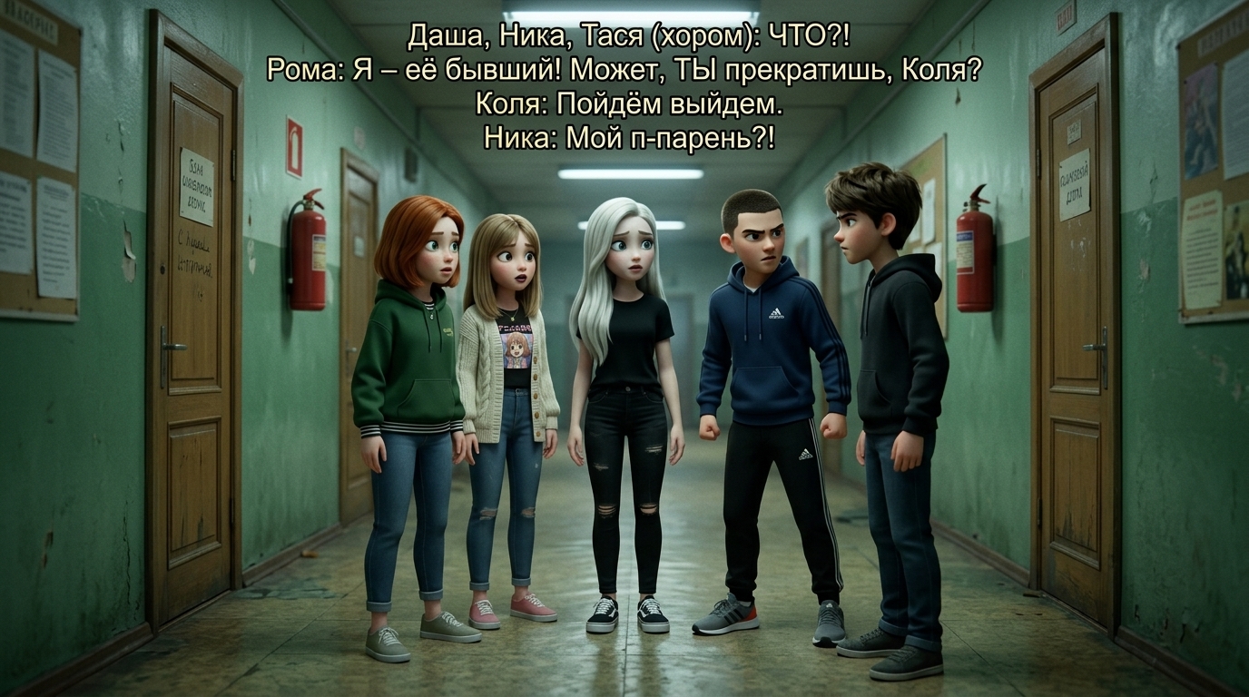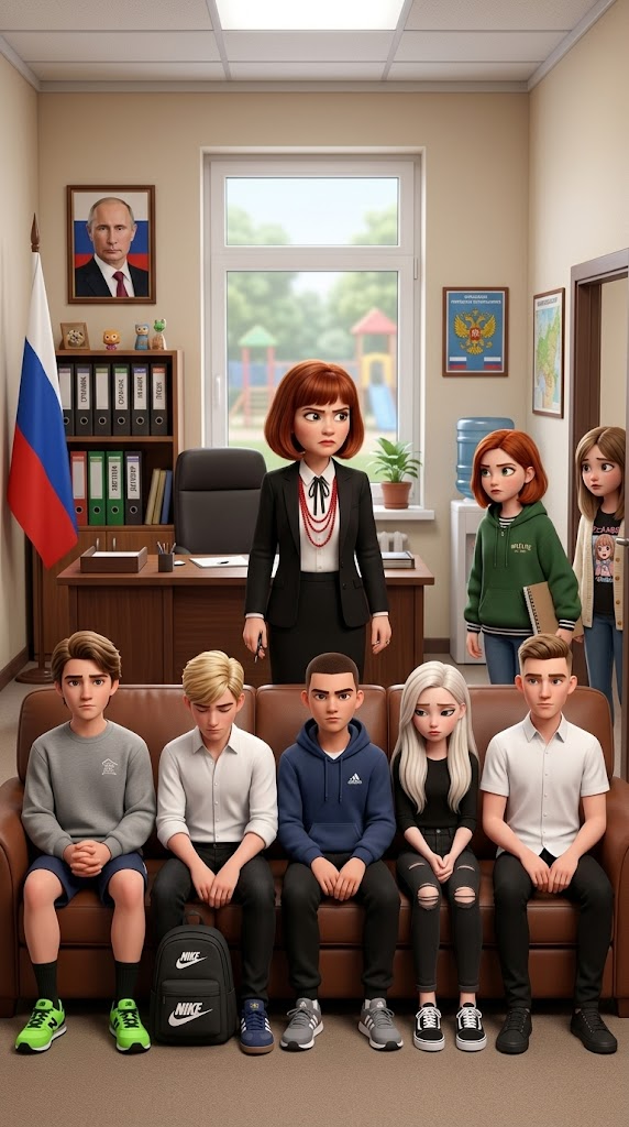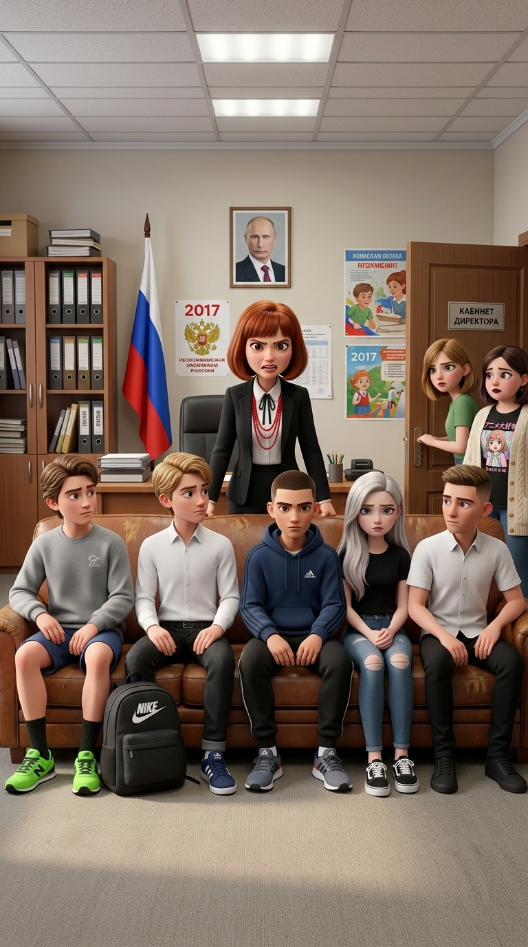 Art style: 3D pixar, вайб 2017 . Кабинет директора в русской школе, 2017 год, выполнен в стилизованной 3D-анимации в духе Pixar: мягкие формы, чистые текстуры, выразительные лица, слегка увеличенные глаза, мультяшная пластика, кинематографичный свет. Интерьер: — массивный стол — шкафы с папками — флаг — портрет на стене — диван Композиция статичная, как стоп-кадр. В центре: * Ольга Федоровна стоит перед диваном, строгая, раздражённая, смотрит на вход На диване: * Коля сидит между Никой и Игорем * рядом Кирилл и блондин с чёрным рюкзаком NIKE * все напряжены У двери (ключевой фокус сцены): * дверь резко открыта * Даша стоит впереди, решительная, указывает в сторону Ники * Тася рядом с ней, напряжённая Ника сидит на диване, на неё указывают ВАЖНО: — взгляд Даши направлен на Нику — внимание всех персонажей смещено к входу Стиль: 3D Pixar-like, cartoon, без фотореализма, мягкое освещение, школьный вайб 2017 ⸻ ОГРАНИЧЕНИЯ (ОБЯЗАТЕЛЬНО): — ЗАПРЕЩЕНО создавать фотореализм — Только 3D анимационный стиль (Pixar-like) — Запрещено менять персонажей — Запрещено менять внешность персонажей — Запрещено менять одежду персонажей — Запрещено менять расположение персонажей — Запрещено добавлять новых персонажей — Все персонажи статичны — Сцена строго: русская школа, 2017 ━━━━━━━━━━━━━━━━━━━━━━━━━━━━━━━━━━━━━━ FINAL STYLE ENFORCEMENT (this is the authoritative rendering directive — it overrides any style wording elsewhere in the prompt): Render this image entirely in "3D pixar, вайб 2017 " style. Match the lighting grammar, material response, colour science, level of realism / stylisation, line weight, and shading model typical of "3D pixar, вайб 2017 ". Keep the subject, composition, camera angle, lighting direction, and colour palette from the description above — but EVERY surface, skin, fabric, material, and environmental element must be rendered in the "3D pixar, вайб 2017 " idiom, not in any other medium. Character appearance reference (MUST match exactly): - Ольга Федоровна: Strong rule: style --- 3D Pixar, вайб 2017 года ---. Женщина средних лет с овальным лицом и светлой кожей, обладающая дружелюбной улыбкой. У неё рыжевато-каштановые волосы средней длины, подстриженные в каре с челкой, и выразительные карие глаза. Она одета в строгую белую рубашку с воротником, черный жакет и тонкий черный галстук-бант. Из аксессуаров на ней длинные красные бусы и кольцо на правой руке. Она сидит за столом в уверенной и открытой позе, держа ручку над документами и излучая профессионализм и доброжелательность. - Коля: Strong rule: style --- 3D Pixar animation style ---. Молодой человек лет 15-ти, мужского пола, с овальным лицом и светлой кожей. У него очень короткая стрижка , темные волосы и карие глаза. Телосложение спортивное. Одет в темно-синюю толстовку , черные спортивные штаны и серые кроссовки adidas. Выражение лица серьезное и уверенное, он стоит в расслабленной позе. Стиль 2к17. 3D PIXAR - Ника: Strong rule: style --- 3D Pixar ---. Strong rule: style --- 3D Pixar ---. Молодая девушка подросток 14ти лет с овальным лицом и светлой, почти фарфоровой кожей. У неё длинные, прямые волосы пепельно-платинового оттенка, уложенные на боковой пробор. Глаза голубого цвета, взгляд спокойный и прямой. Черты лица нежные, губы тронуты легкой, едва заметной улыбкой. С выразительными ресницами. Она стройного телосложения, одета по стилю 2к17 в черных тонах топ и рваные скинни и в вансах. Поза естественная, голова слегка наклонена в сторону, выражение лица безмятежное и приветливое. - Игорь: Strong rule: style --- 3D Pixar ---. Молодой человек 16ти с овальным лицом и светлой кожей. У него короткие светло-русые волосы, уложенные наверх в стиле андеркат. Глаза светлые, взгляд спокой