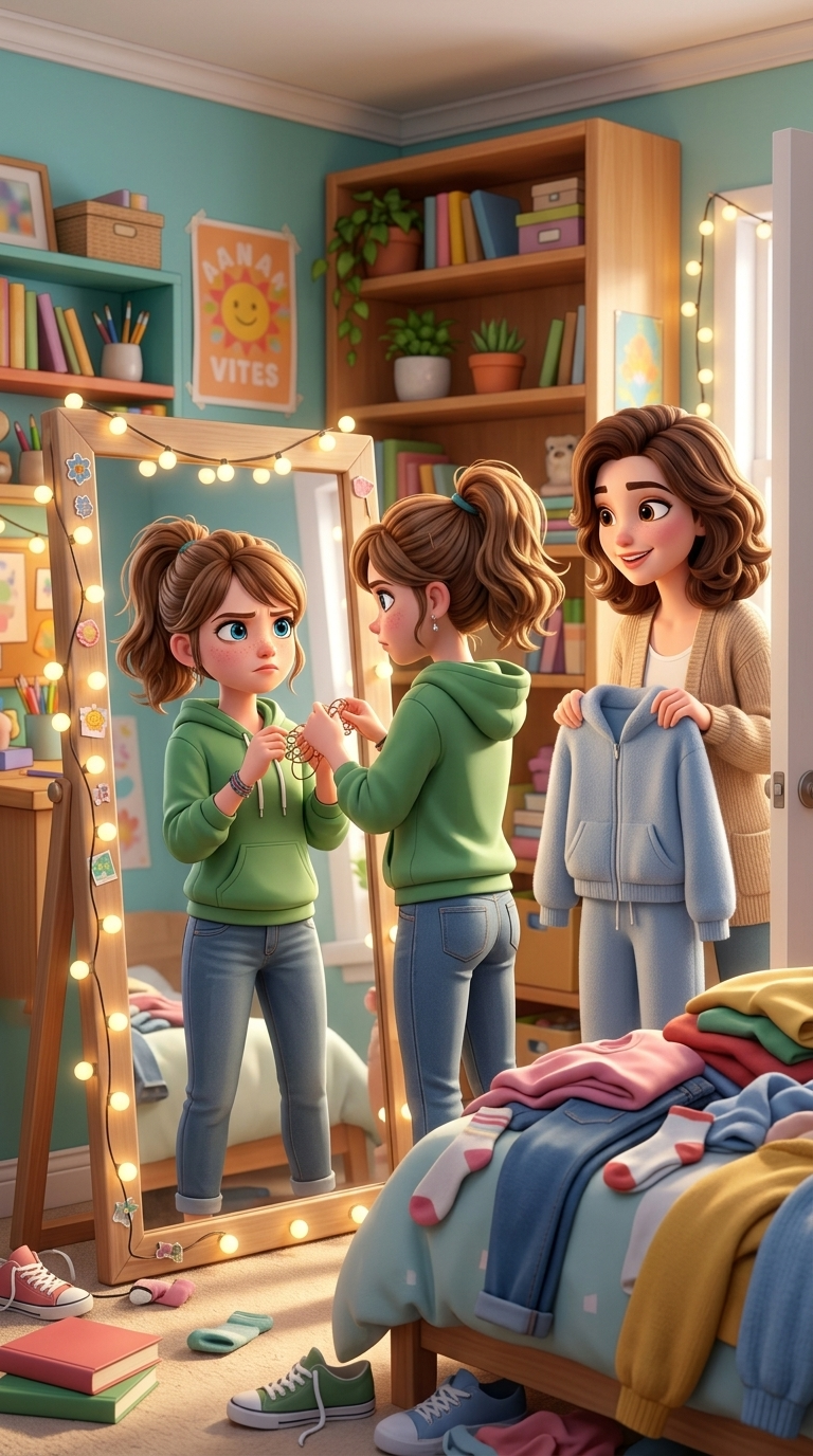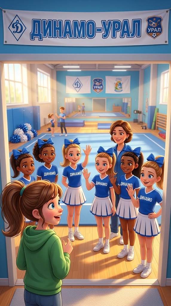 Art style: Яркая и красочная 3D-анимация в стиле студии Pi.... Кадр от первого лица (глазами Алисы): дверь открывается, и в кадр врывается яркий свет. В просторном, залитом светом зале её встречает группа улыбающихся девочек её возраста с блестящими помпонами в руках. Одна из них дружелюбно машет ей. Чирлидерша зовёт Алису и говорит : Алиса мы очень рады видеть тебя в нашей команде ! ━━━━━━━━━━━━━━━━━━━━━━━━━━━━━━━━━━━━━━ FINAL STYLE ENFORCEMENT (this is the authoritative rendering directive — it overrides any style wording elsewhere in the prompt): Render this image entirely in "Яркая и красочная 3D-анимация в стиле студии Pi..." style. Match the lighting grammar, material response, colour science, level of realism / stylisation, line weight, and shading model typical of "Яркая и красочная 3D-анимация в стиле студии Pi...". Keep the subject, composition, camera angle, lighting direction, and colour palette from the description above — but EVERY surface, skin, fabric, material, and environmental element must be rendered in the "Яркая и красочная 3D-анимация в стиле студии Pi..." idiom, not in any other medium. Character appearance reference (MUST match exactly): - Алиса: Strong rule: style --- Яркая и красочная 3D-анимация в стиле студии Pi... ---. Молодая девушка-подросток с круглым лицом, светлой кожей и нежным румянцем на щеках. У нее огромные, выразительные ярко-голубые глаза и маленькая, застенчивая улыбка. Светло-каштановые волосы собраны в высокий небрежный хвост с прядями, обрамляющими лицо. Она одета в простую зеленую толстовку с капюшоном. Ее поза выражает радостное удивление, руки слегка приподняты. Персонаж выполнен в стиле современной 2D-анимации с мягкими тенями и четкими линиями.