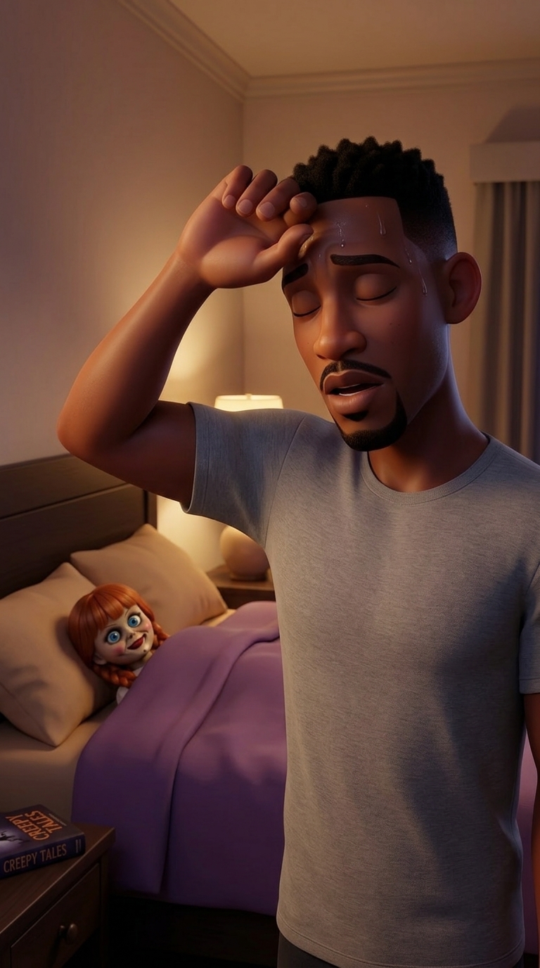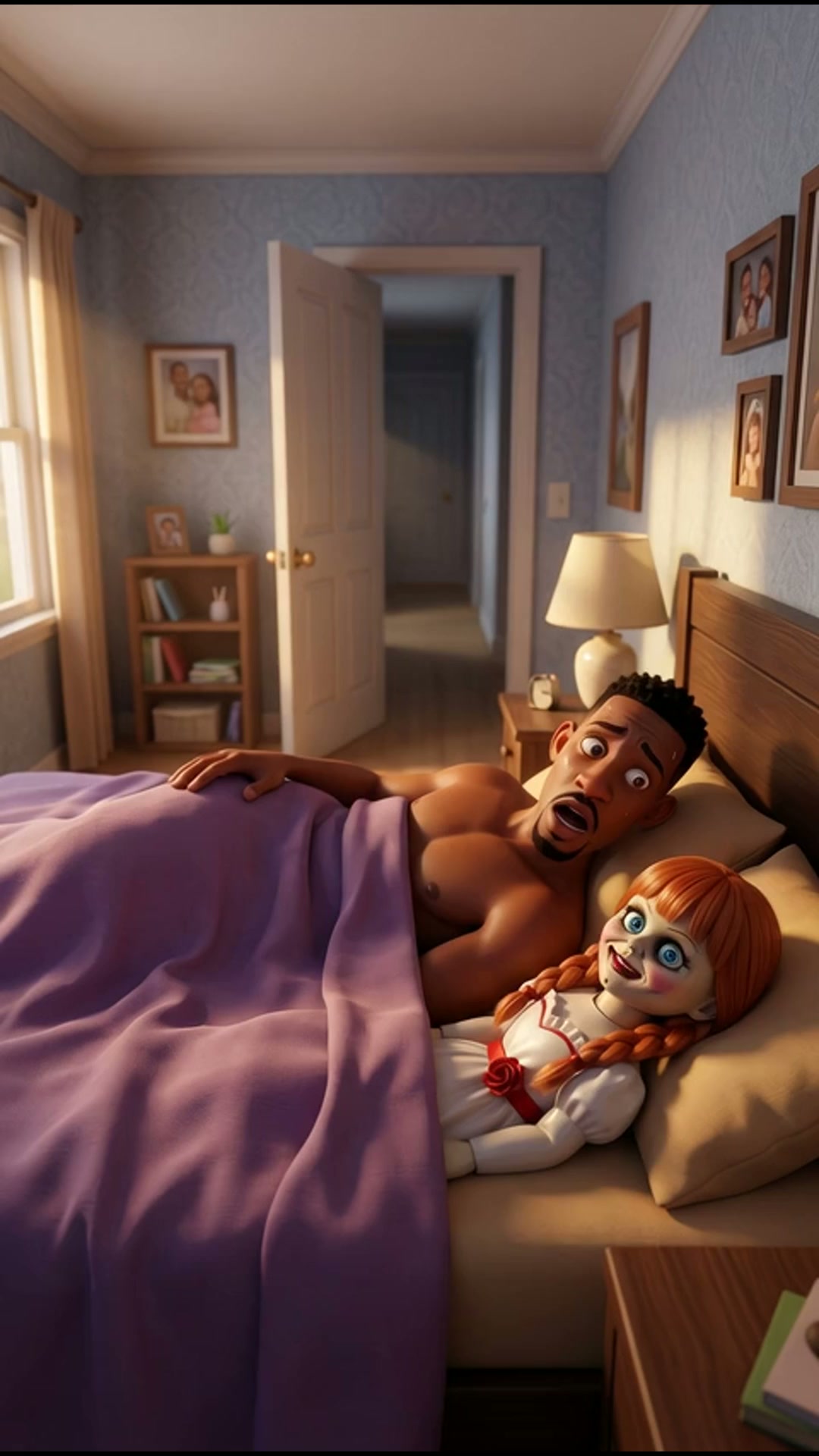 Art style: 3D Pixar. Малкольм стоит посреди комнаты, уже одетый в футболку, и пытается спрятать куклу Эбигейл под одеяло. Он с виноватой и испуганной улыбкой кричит в сторону двери. Стиль Pixar. ━━━━━━━━━━━━━━━━━━━━━━━━━━━━━━━━━━━━━━ FINAL STYLE ENFORCEMENT (this is the authoritative rendering directive — it overrides any style wording elsewhere in the prompt): Render this image entirely in "3D Pixar" style. Match the lighting grammar, material response, colour science, level of realism / stylisation, line weight, and shading model typical of "3D Pixar". Keep the subject, composition, camera angle, lighting direction, and colour palette from the description above — but EVERY surface, skin, fabric, material, and environmental element must be rendered in the "3D Pixar" idiom, not in any other medium. Character appearance reference (MUST match exactly): - Малкольм: Молодой темнокожий мужчина атлетичного телосложения в стиле 3D-анимации. У него овальное лицо, короткие черные текстурированные волосы с аккуратным фейдом и выразительные карие глаза. На лице аккуратная бородка и усы. Выражение лица крайне удивленное: брови приподняты, глаза широко раскрыты, рот слегка приоткрыт. Он изображен по пояс, без рубашки, лежащим в постели под фиолетовым одеялом, демонстрируя мускулистую грудь и плечи. - Эбигейл: Жуткая кукла-девочка с круглым фарфоровым лицом и неестественно бледной, гладкой кожей. У неё ярко-рыжие волосы с густой прямой челкой, заплетенные в две тугие косы с красными лентами на концах. Огромные, широко распахнутые ярко-голубые глаза обрамлены длинными черными ресницами. На щеках нарисован яркий розовый румянец, а на подбородке видна маленькая темная родинка. Лицо застыло в широкой, пугающей улыбке с накрашенными красными губами. Кукла одета в белое винтажное платье с пышными рукавами-фонариками, украшенное красной тесьмой и оборками. Тело миниатюрное и хрупкое, поза статичная, передающая эффект зловещей неподвижности.
