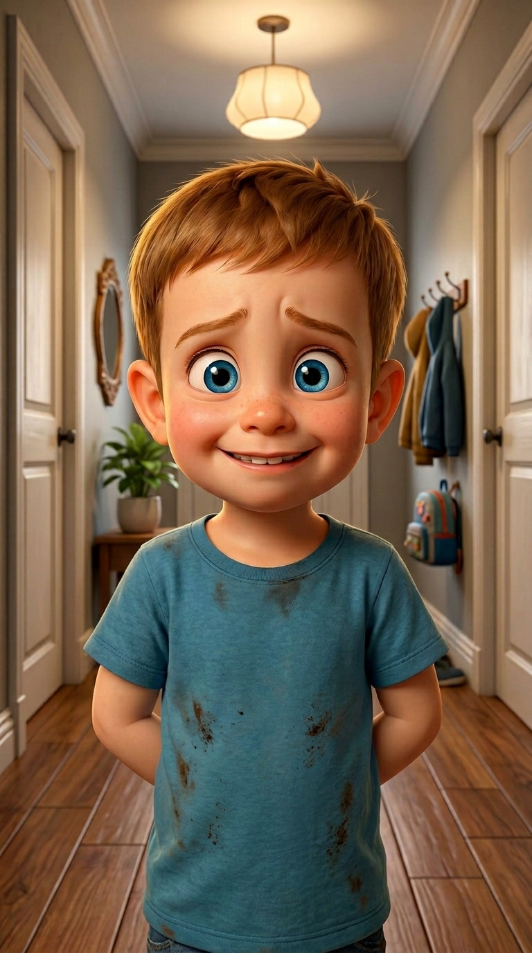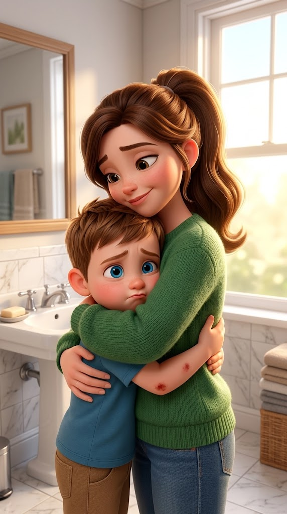 Art style: 3D Pixar. The boy and his mother hugging tightly in the brightly lit bathroom. The boy looks sincere and apologetic. 3D Pixar style. ━━━━━━━━━━━━━━━━━━━━━━━━━━━━━━━━━━━━━━ FINAL STYLE ENFORCEMENT (this is the authoritative rendering directive — it overrides any style wording elsewhere in the prompt): Render this image entirely in "3D Pixar" style. Match the lighting grammar, material response, colour science, level of realism / stylisation, line weight, and shading model typical of "3D Pixar". Keep the subject, composition, camera angle, lighting direction, and colour palette from the description above — but EVERY surface, skin, fabric, material, and environmental element must be rendered in the "3D Pixar" idiom, not in any other medium. Character appearance reference (MUST match exactly): - Максим: Sorry, Gemini API returned an empty response. Please try with a different AI model. - Мама: Strong rule: style --- 3D Pixar ---. Kind woman in her 30s, warm smile, brown hair tied in a ponytail, wearing a cozy green sweater and jeans, 3D Pixar style Reference images context (match the visual style and elements from these): - Маленький мальчик с мороженым (character): Маленький мальчик с большими голубыми глазами и каштановыми волосами в синей футболке радостно держит шоколадное мороженое. Изображение выполнено в стиле современной 3D-анимации с акцентом на яркие эмоции и детализированную текстуру.