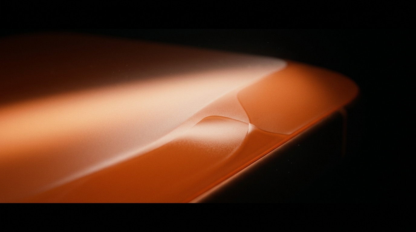 Art style: Кинематографичный, футуристичный, минималистичн.... Макро-снимок абстрактной оранжевой текстуры iphone 17 pro, по которой медленно скользит мягкий свет, выявляя идеальную полировку. Темный фон, минимализм. Ощущение тайны и ожидания. Стиль - Apple commercial. ━━━━━━━━━━━━━━━━━━━━━━━━━━━━━━━━━━━━━━ FINAL STYLE ENFORCEMENT (this is the authoritative rendering directive — it overrides any style wording elsewhere in the prompt): Render this image entirely in "Кинематографичный, футуристичный, минималистичн..." style. Match the lighting grammar, material response, colour science, level of realism / stylisation, line weight, and shading model typical of "Кинематографичный, футуристичный, минималистичн...". Keep the subject, composition, camera angle, lighting direction, and colour palette from the description above — but EVERY surface, skin, fabric, material, and environmental element must be rendered in the "Кинематографичный, футуристичный, минималистичн..." idiom, not in any other medium.