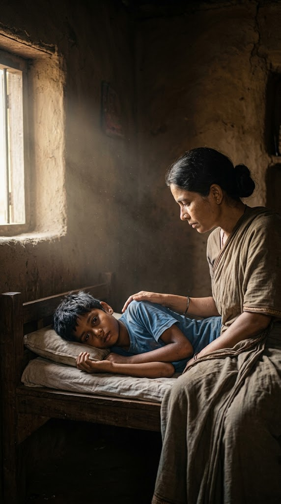 Art style: Cinematic Realistic. A cramped, dimly lit bedroom inside a small earthen house with rough-textured walls. A single small window allows a beam of soft, hazy morning sunlight to cut through the dust motes in the air. A young boy lies on a thin mattress on a simple wooden bed frame. A woman leans over him, her hand gently touching his shoulder. The atmosphere is somber yet tender, with a dominant palette of deep browns, dusty yellows, and soft blues. ━━━━━━━━━━━━━━━━━━━━━━━━━━━━━━━━━━━━━━ FINAL STYLE ENFORCEMENT (this is the authoritative rendering directive — it overrides any style wording elsewhere in the prompt): Render this image entirely in "Cinematic Realistic" style. Match the lighting grammar, material response, colour science, level of realism / stylisation, line weight, and shading model typical of "Cinematic Realistic". Keep the subject, composition, camera angle, lighting direction, and colour palette from the description above — but EVERY surface, skin, fabric, material, and environmental element must be rendered in the "Cinematic Realistic" idiom, not in any other medium. Character appearance reference (MUST match exactly): - Rahul: A 10-year-old boy with a thin, lithe build and sun-kissed brown skin. He has messy, short black hair and large, expressive dark eyes that look weary. He wears a simple, slightly oversized blue cotton t-shirt that is worn and faded. His expression is one of quiet determination and innocence. He is set against the backdrop of a humble, rustic village home. The lighting is soft and natural, emphasizing his youthful features and the texture of his simple clothing. The style is detailed and evocative, capturing a soulful energy. - Asha: A woman in her late 30s with a gentle, weathered face and kind, observant eyes. Her dark hair is pulled back in a simple bun. She wears a traditional, modest cotton sari in muted earth tones, showing signs of frequent washing. Her expression is filled with maternal concern and quiet strength. She is positioned in a dimly lit, rustic interior with mud walls. The lighting is warm and directional, casting soft shadows that highlight the lines of care on her face. Her energy is nurturing and resilient.