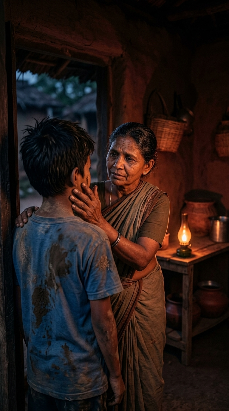 Art style: Cinematic Realistic. A low-angle shot outside a humble mud hut at dawn. A young boy in a blue shirt stands by a weathered stone basin, splashing cold water onto his face from a rusted metal bucket. The sky is a pale, cool blue with hints of morning mist rising from the ground. The mood is quiet and introspective. The color palette consists of cool teals, grey-blues, and the dark brown of wet earth. ━━━━━━━━━━━━━━━━━━━━━━━━━━━━━━━━━━━━━━ FINAL STYLE ENFORCEMENT (this is the authoritative rendering directive — it overrides any style wording elsewhere in the prompt): Render this image entirely in "Cinematic Realistic" style. Match the lighting grammar, material response, colour science, level of realism / stylisation, line weight, and shading model typical of "Cinematic Realistic". Keep the subject, composition, camera angle, lighting direction, and colour palette from the description above — but EVERY surface, skin, fabric, material, and environmental element must be rendered in the "Cinematic Realistic" idiom, not in any other medium. Character appearance reference (MUST match exactly): - Rahul: A 10-year-old boy with a thin, lithe build and sun-kissed brown skin. He has messy, short black hair and large, expressive dark eyes that look weary. He wears a simple, slightly oversized blue cotton t-shirt that is worn and faded. His expression is one of quiet determination and innocence. He is set against the backdrop of a humble, rustic village home. The lighting is soft and natural, emphasizing his youthful features and the texture of his simple clothing. The style is detailed and evocative, capturing a soulful energy.