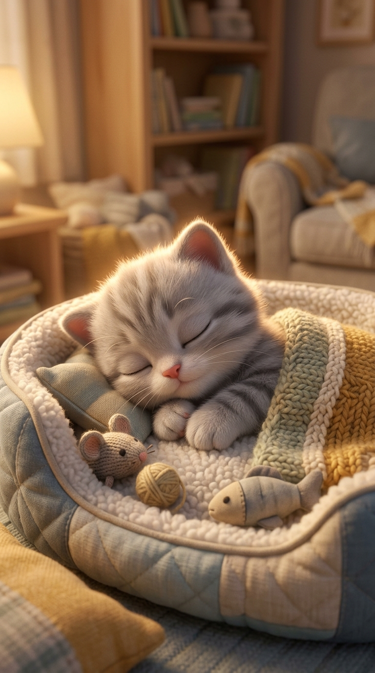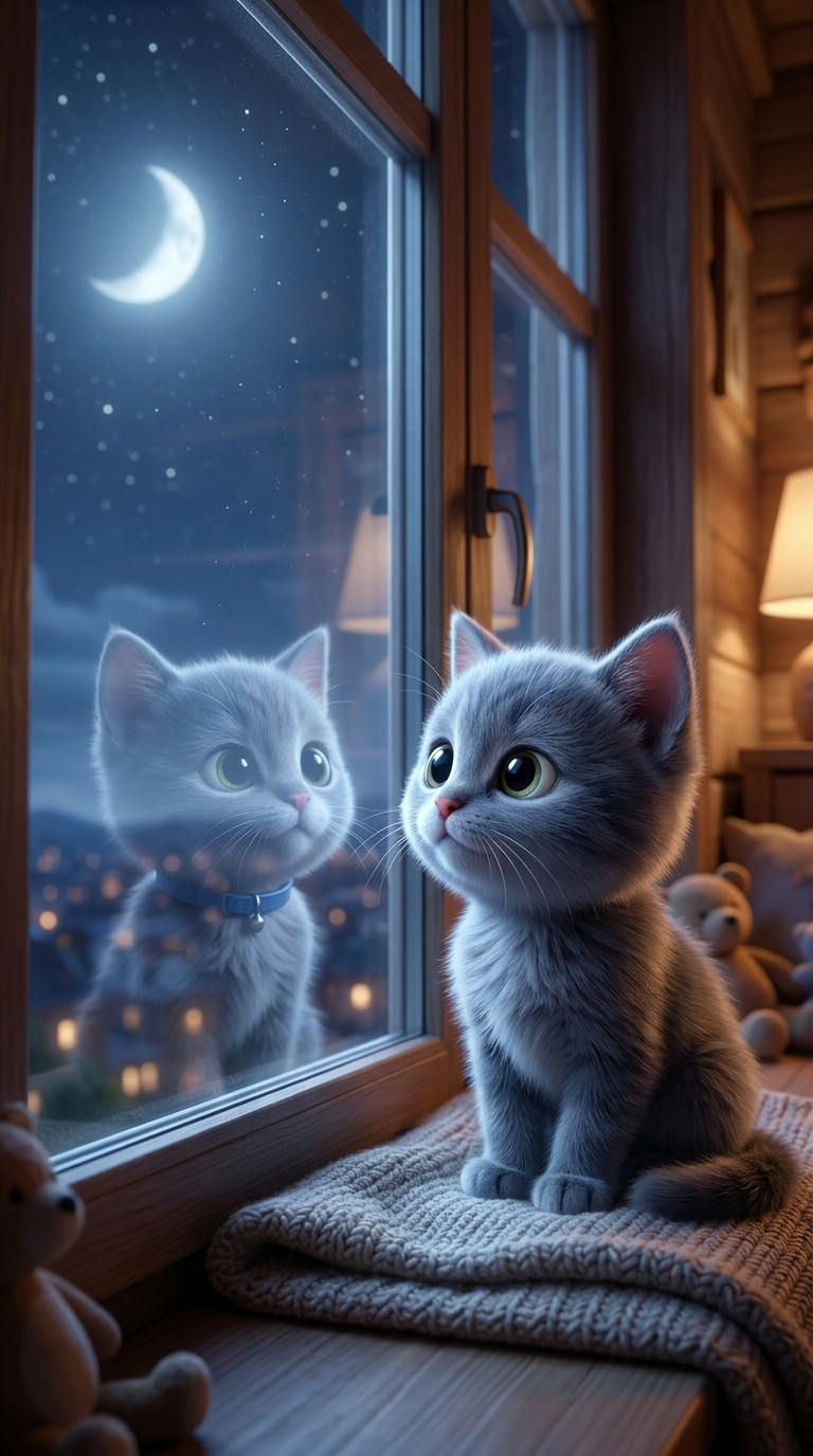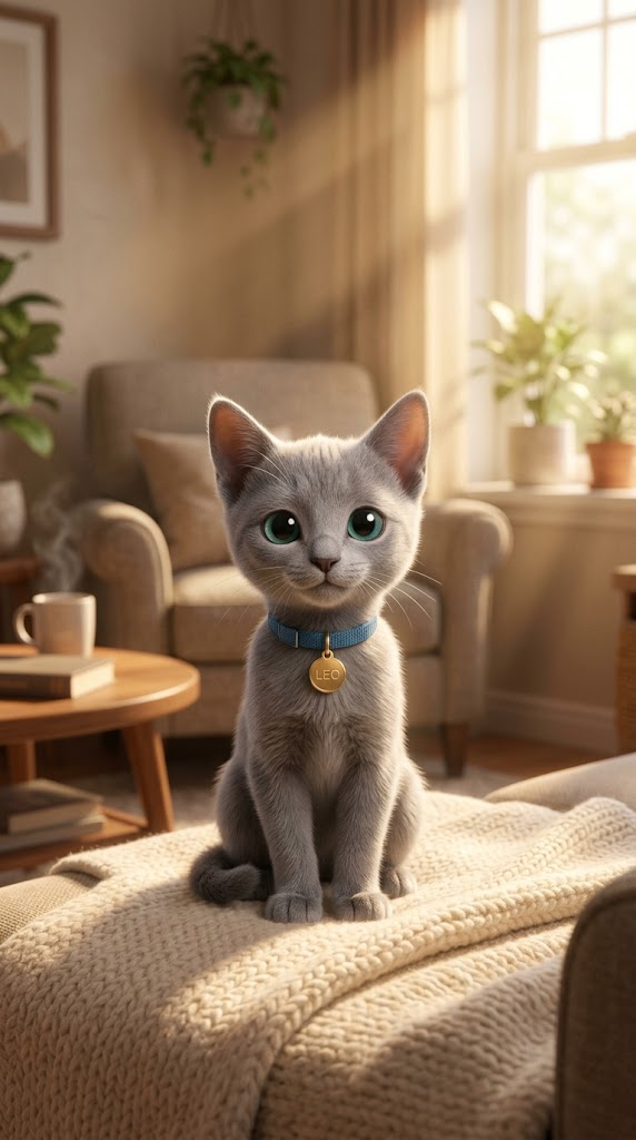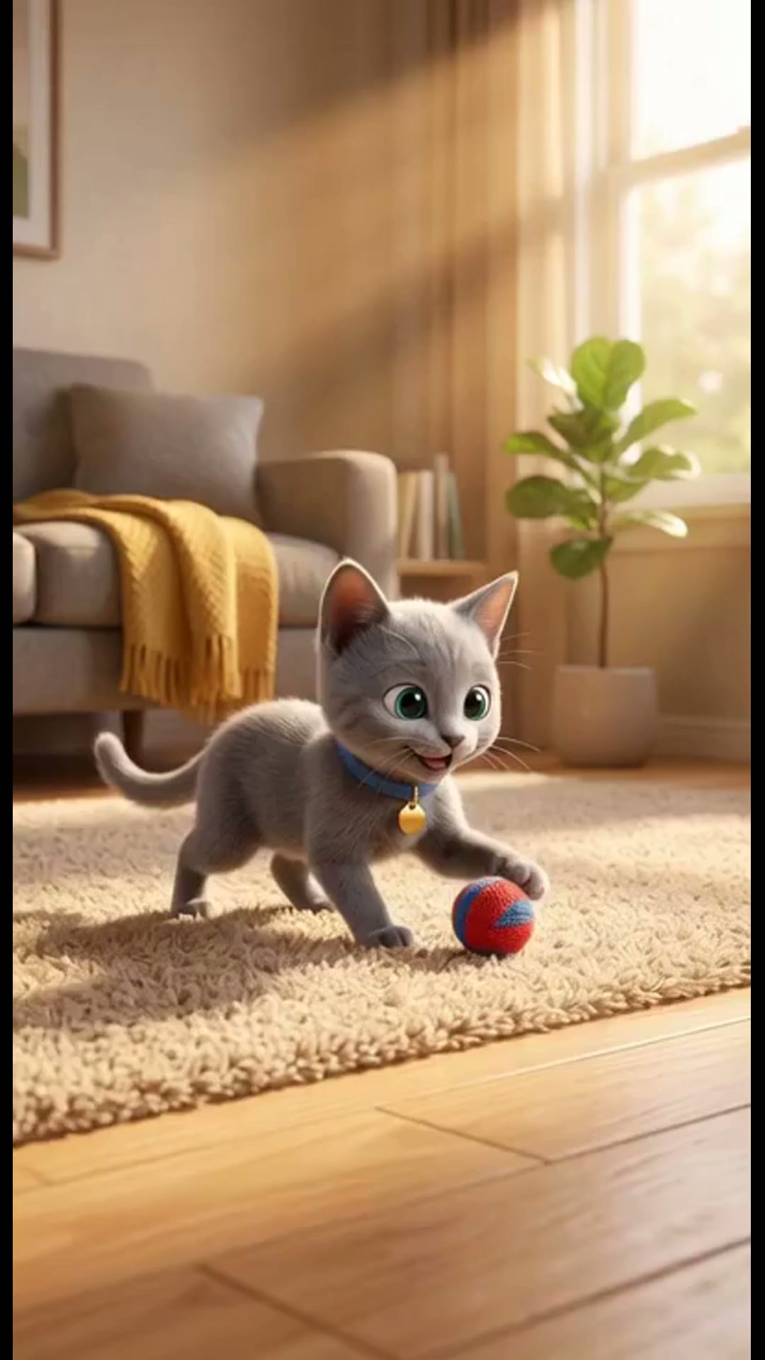Art style: Pixar-style 3D animation, cinematic, warm and e.... Vertical video 9:16. Cozy modern living room with warm sunlight. Leo, a small Russian Blue kitten with a blue collar, happily plays on a soft carpet with a small toy ball. He runs, jumps, and gently bats the toy. The environment feels warm, safe, and inviting — wooden floor, soft textures, golden light from the window. same character: small Russian Blue kitten named Leo, short silver-gray fur, slightly narrow face, large round teal eyes, small nose, soft whiskers, wearing a blue collar with a small gold tag, Pixar-style 3D animation, consistent appearance across scenes. cinematic lighting, 4k, high detail, soft shadows, volumetric light, depth of field, smooth animation, vertical framing for social media reels. ━━━━━━━━━━━━━━━━━━━━━━━━━━━━━━━━━━━━━━ FINAL STYLE ENFORCEMENT (this is the authoritative rendering directive — it overrides any style wording elsewhere in the prompt): Render this image entirely in "Pixar-style 3D animation, cinematic, warm and e..." style. Match the lighting grammar, material response, colour science, level of realism / stylisation, line weight, and shading model typical of "Pixar-style 3D animation, cinematic, warm and e...". Keep the subject, composition, camera angle, lighting direction, and colour palette from the description above — but EVERY surface, skin, fabric, material, and environmental element must be rendered in the "Pixar-style 3D animation, cinematic, warm and e..." idiom, not in any other medium. Character appearance reference (MUST match exactly): - Leo: small Russian Blue kitten named Leo, short silver-gray fur, slightly narrow face, large round teal eyes, small nose, soft whiskers, wearing a blue collar with a small gold tag, Pixar-style 3D animation, consistent appearance across scenes