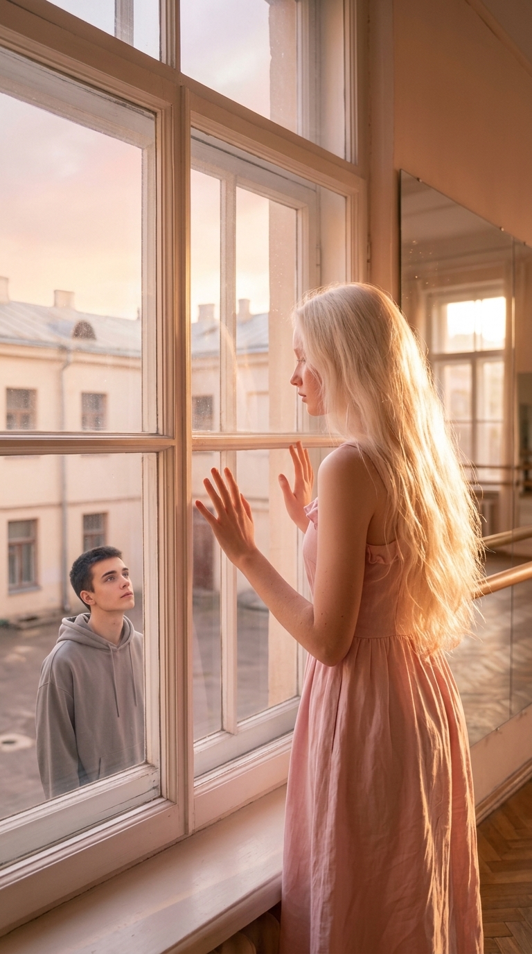Strong rule: style --- Cinematic Realistic ---. Девушка с фарфоровой кожей, россыпью веснушек на носу и длинными белоснежными волосами. Она одета в легкий сарафан пастельно-розового цвета. Взгляд добрый, немного грустный и преданный. Фон — уютный танцевальный класс с зеркалами и балетным станком. Мягкий свет из окна создает ореол вокруг ее волос. Преобладают светлые, эфирные оттенки: кремовый, нежно-розовый и жемчужный. Образ излучает чистоту и искренность.