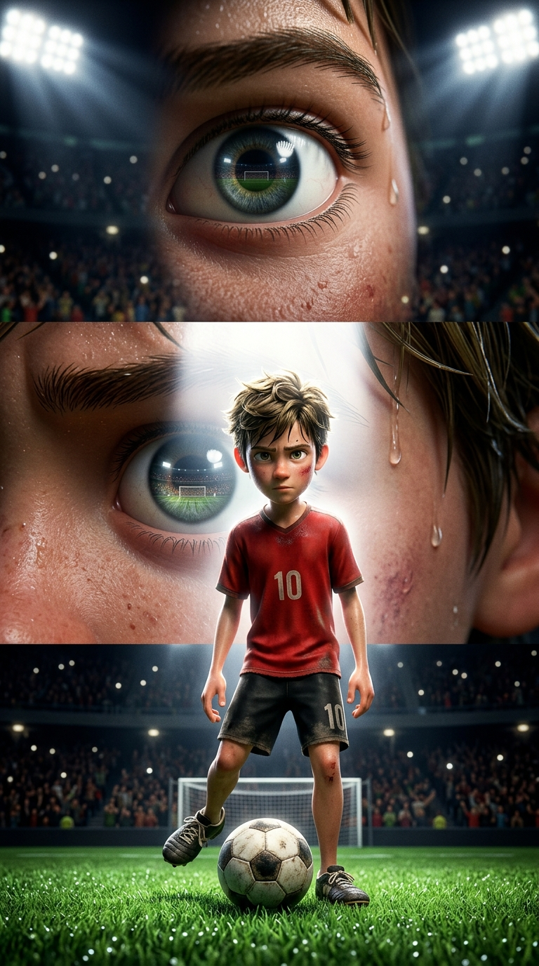 Art style: 3D Pixar-style Animation. Решающий момент на огромном стадионе под светом мощных прожекторов. Артём стоит перед мячом на точке пенальти, его фигура окутана ярким белым сиянием. На заднем плане трибуны превратились в размытое море огней и теней. Камера — экстремальный крупный план его глаз, в которых отражается футбольный мяч и ворота. Освещение — ослепительно белые лучи прожекторов, создающие эффект ореола вокруг его головы и плеч. Цвета: изумрудно-зеленый газон, ослепительно белый свет и глубокий черный фон трибун. Текстура каждой травинки, покрытой росой, и микроскопические ворсинки на поверхности мяча. Атмосфера звенящей тишины перед взрывом эмоций. Микро-детали: капля пота, медленно стекающая по виску, расширенные зрачки, отражение сетки ворот в радужке глаза. ━━━━━━━━━━━━━━━━━━━━━━━━━━━━━━━━━━━━━━ FINAL STYLE ENFORCEMENT (this is the authoritative rendering directive — it overrides any style wording elsewhere in the prompt): Render this image entirely in "3D Pixar-style Animation" style. Match the lighting grammar, material response, colour science, level of realism / stylisation, line weight, and shading model typical of "3D Pixar-style Animation". Keep the subject, composition, camera angle, lighting direction, and colour palette from the description above — but EVERY surface, skin, fabric, material, and environmental element must be rendered in the "3D Pixar-style Animation" idiom, not in any other medium. Character appearance reference (MUST match exactly): - Артём: Подросток 14 лет с атлетическим телосложением и взъерошенными темно-русыми волосами, на которых видны капли пота. Его лицо выражает предельную концентрацию, на щеке небольшая ссадина. Он одет в поношенную, но чистую красную футбольную джерси с номером 10 на спине и потертые черные шорты. На ногах старые, многократно заштопанные бутсы с белыми шнурками. Его взгляд прямой и решительный. Фон — сумеречный городской двор с индустриальными элементами. Освещение контрастное: холодный свет уличных фонарей смешивается с теплыми отблесками заходящего солнца, создавая драматические тени на его лице. Стиль — современная спортивная драма с высокой детализацией пор кожи и текстуры ткани.