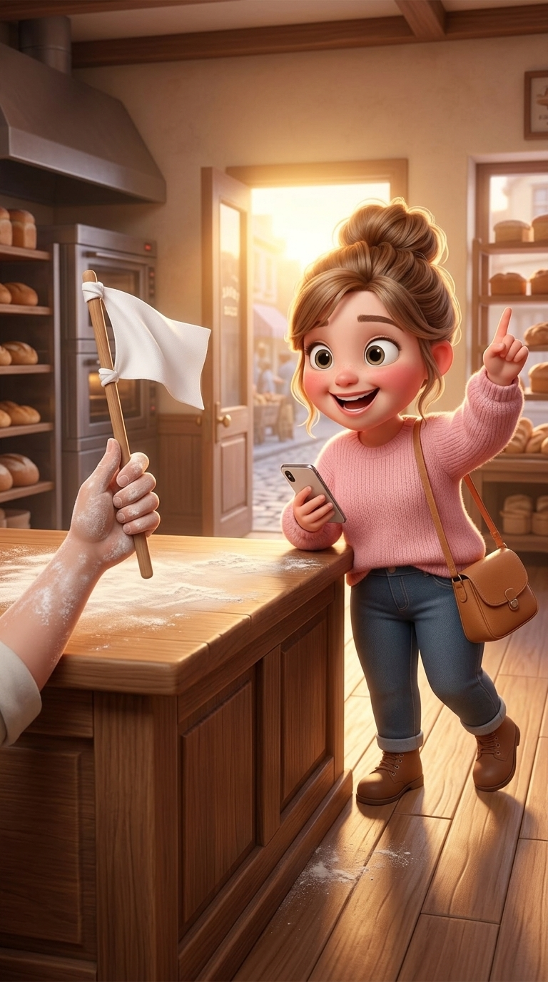 Art style: 3D Pixar. Behind the customer on the far wall there is a bakery entrance door — slightly ajar, warm morning light coming through it, showing she just walked in from outside. A young woman customer with light brown hair in a loose messy bun, big round innocent eyes, rosy cheeks, wearing a cozy pastel pink sweater and carrying a small handbag — standing ON THE OUTSIDE of the counter leaning over from the front, holding her phone in one hand and raising one finger enthusiastically with a huge excited smile. She is clearly on the customer side of the counter — the door she entered through is visible behind her. On the LEFT side of the frame, "a baker's hand and forearm reach up from BEHIND the counter on the left side — appearing from the side of the counter not through the surface — holding a wooden spoon with a white cloth firmly tied to the top of it forming a clear white flag shape, waving it above the counter edge. The hand comes from the side not through the wood, only the hand and wrist visible, the rest of the body completely hidden behind the counter — holding a wooden spoon with a white cloth tied to it, waving it weakly above the counter edge like a surrender flag. Flour dusted counter between them. No cake visible. 3D Pixar-style animation, warm golden dawn lighting, wide shot. ━━━━━━━━━━━━━━━━━━━━━━━━━━━━━━━━━━━━━━ FINAL STYLE ENFORCEMENT (this is the authoritative rendering directive — it overrides any style wording elsewhere in the prompt): Render this image entirely in "3D Pixar" style. Match the lighting grammar, material response, colour science, level of realism / stylisation, line weight, and shading model typical of "3D Pixar". Keep the subject, composition, camera angle, lighting direction, and colour palette from the description above — but EVERY surface, skin, fabric, material, and environmental element must be rendered in the "3D Pixar" idiom, not in any other medium.