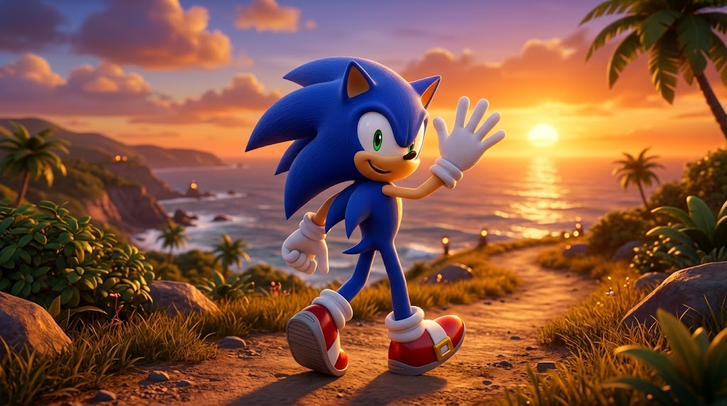 Art style: 3D Pixar. Соник машет рукой на прощание, улыбаясь, и уже начинает разворачиваться для бега. На фоне закатное солнце, создающее теплый оранжевый свет. ━━━━━━━━━━━━━━━━━━━━━━━━━━━━━━━━━━━━━━ FINAL STYLE ENFORCEMENT (this is the authoritative rendering directive — it overrides any style wording elsewhere in the prompt): Render this image entirely in "3D Pixar" style. Match the lighting grammar, material response, colour science, level of realism / stylisation, line weight, and shading model typical of "3D Pixar". Keep the subject, composition, camera angle, lighting direction, and colour palette from the description above — but EVERY surface, skin, fabric, material, and environmental element must be rendered in the "3D Pixar" idiom, not in any other medium.