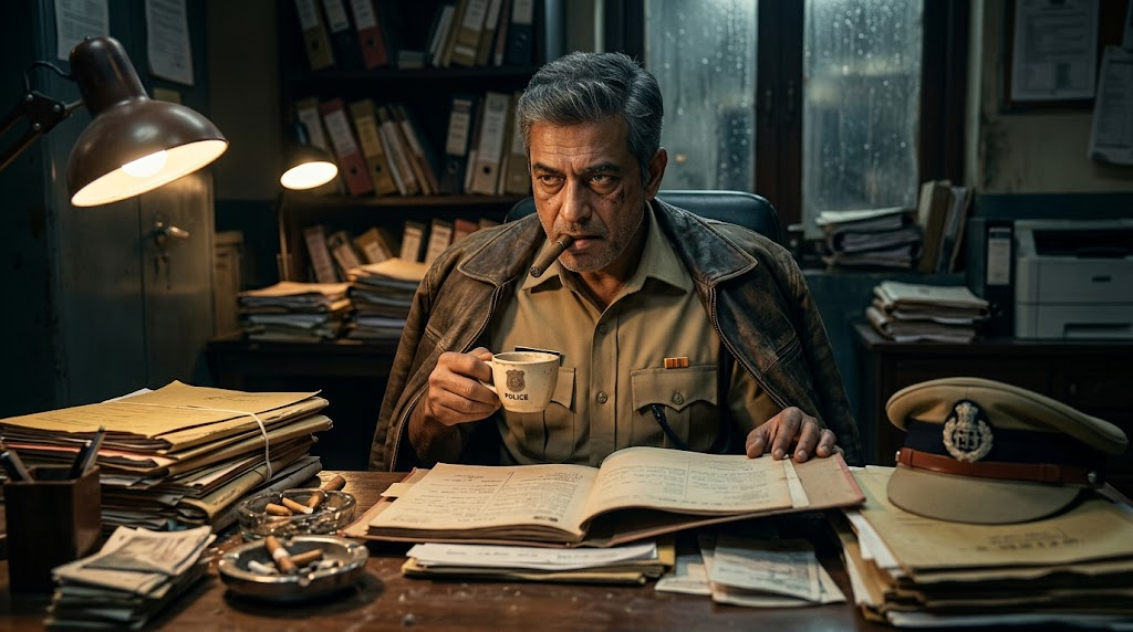 Art style: Cinematic Realistic. इंस्पेक्टर खन्ना अपने अस्त-व्यस्त ऑफिस में बैठे हैं, चारों ओर फाइलों के ढेर हैं। वे एक पुरानी फाइल पढ़ रहे हैं और उनके हाथ में एक आधा खाली कॉफी का कप है। उनकी आँखों में अनुभव की चमक और संदेह है। उन्होंने अपनी पुलिस की टोपी मेज पर रखी है। ━━━━━━━━━━━━━━━━━━━━━━━━━━━━━━━━━━━━━━ FINAL STYLE ENFORCEMENT (this is the authoritative rendering directive — it overrides any style wording elsewhere in the prompt): Render this image entirely in "Cinematic Realistic" style. Match the lighting grammar, material response, colour science, level of realism / stylisation, line weight, and shading model typical of "Cinematic Realistic". Keep the subject, composition, camera angle, lighting direction, and colour palette from the description above — but EVERY surface, skin, fabric, material, and environmental element must be rendered in the "Cinematic Realistic" idiom, not in any other medium. Character appearance reference (MUST match exactly): - इंस्पेक्टर खन्ना: एक 50 वर्षीय अनुभवी पुलिस अधिकारी, जिसने खाकी वर्दी और एक पुरानी चमड़े की जैकेट पहनी है। उसके बाल सफेद हो रहे हैं और उसकी आँखों के नीचे थकान की रेखाएँ हैं। वह एक सिगार पी रहा है और एक अपराध स्थल पर जाँच कर रहा है। उसके हाथ में एक मैग्नीफाइंग ग्लास है। बैकग्राउंड में पुलिस की गाड़ियाँ और पीली टेप है। लाइटिंग नाटकीय है, जैसे किसी पुरानी जासूसी फिल्म में होती है। वह बहुत ही चतुर और अनुभवी दिखता है।