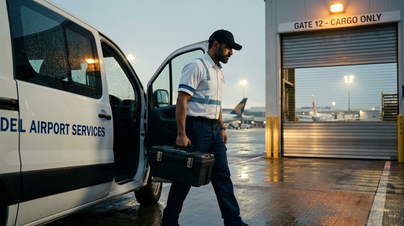 Art style: Cinematic Realistic. आर्यन एक सफेद और नीली एयरपोर्ट रखरखाव कर्मचारी की वर्दी में एक वैन से बाहर निकल रहा है। उसके हाथ में एक काला टूलबॉक्स है और उसने सिर पर एक टोपी पहनी है जिससे उसका चेहरा आधा ढका हुआ है। वह बिना किसी हिचकिचाहट के मुख्य कार्गो गेट की ओर बढ़ रहा है। ━━━━━━━━━━━━━━━━━━━━━━━━━━━━━━━━━━━━━━ FINAL STYLE ENFORCEMENT (this is the authoritative rendering directive — it overrides any style wording elsewhere in the prompt): Render this image entirely in "Cinematic Realistic" style. Match the lighting grammar, material response, colour science, level of realism / stylisation, line weight, and shading model typical of "Cinematic Realistic". Keep the subject, composition, camera angle, lighting direction, and colour palette from the description above — but EVERY surface, skin, fabric, material, and environmental element must be rendered in the "Cinematic Realistic" idiom, not in any other medium. Character appearance reference (MUST match exactly): - आर्यन: Strong rule: style --- Cinematic Realistic ---. एक 42 वर्षीय भारतीय पुरुष, जिसकी आँखों में एक रणनीतिकार की चमक है। उसने गहरे नीले रंग की टर्टलनेक शर्ट और काली जैकेट पहनी है। उसके बाल सलीके से पीछे की ओर संवारे हुए हैं और एक छोटी, कटी हुई दाढ़ी है। वह एक अंधेरे कमरे में है जहाँ केवल कंप्यूटर स्क्रीन की नीली रोशनी उसके चेहरे पर पड़ रही है। उसके पीछे एक बड़ा डिजिटल नक्शा है। शैली यथार्थवादी और सिनेमाई है, जिसमें बारीक विवरण और गहरी छायाएँ हैं। वह शांत लेकिन खतरनाक दिखता है।