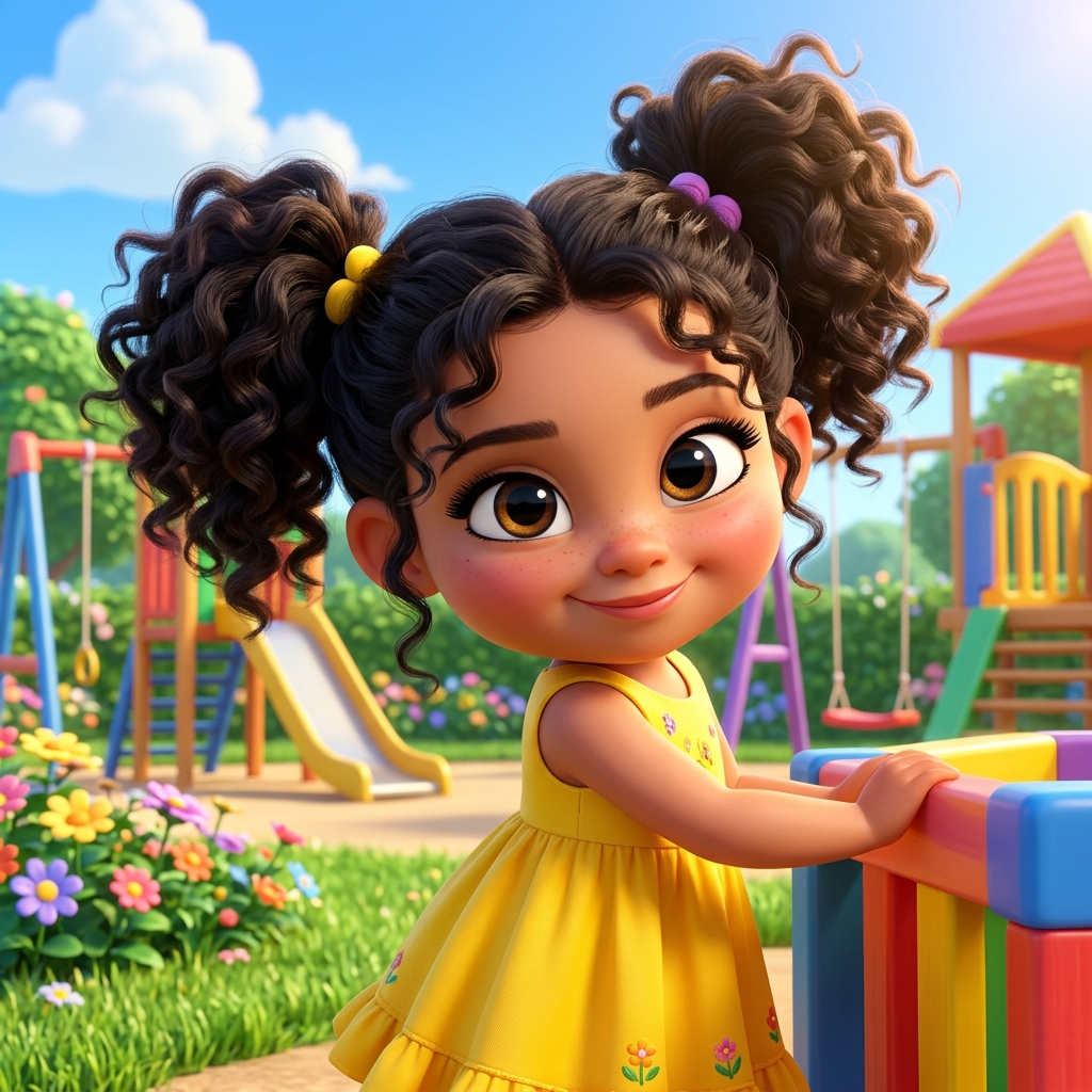 Strong rule: style --- Яркий и красочный 3D-анимационный стиль, как в ... ---. 4-летняя девочка, темные густые кудрявые волосы, часто собранные в два забавных хвостика, большие карие глаза с черными ресницами. Очаровательная и хитрая улыбка. Одета в яркое желтое платьице.