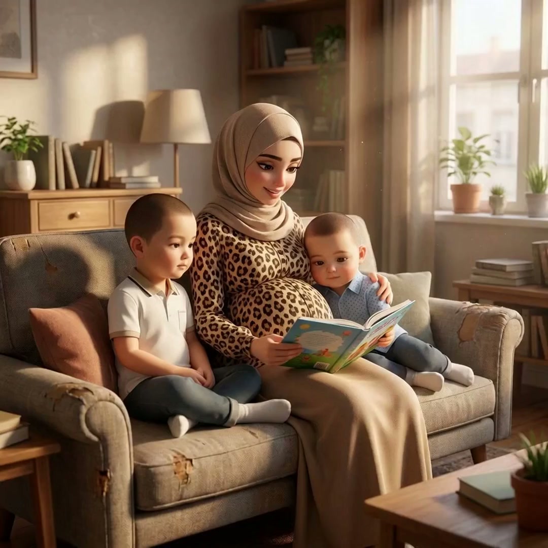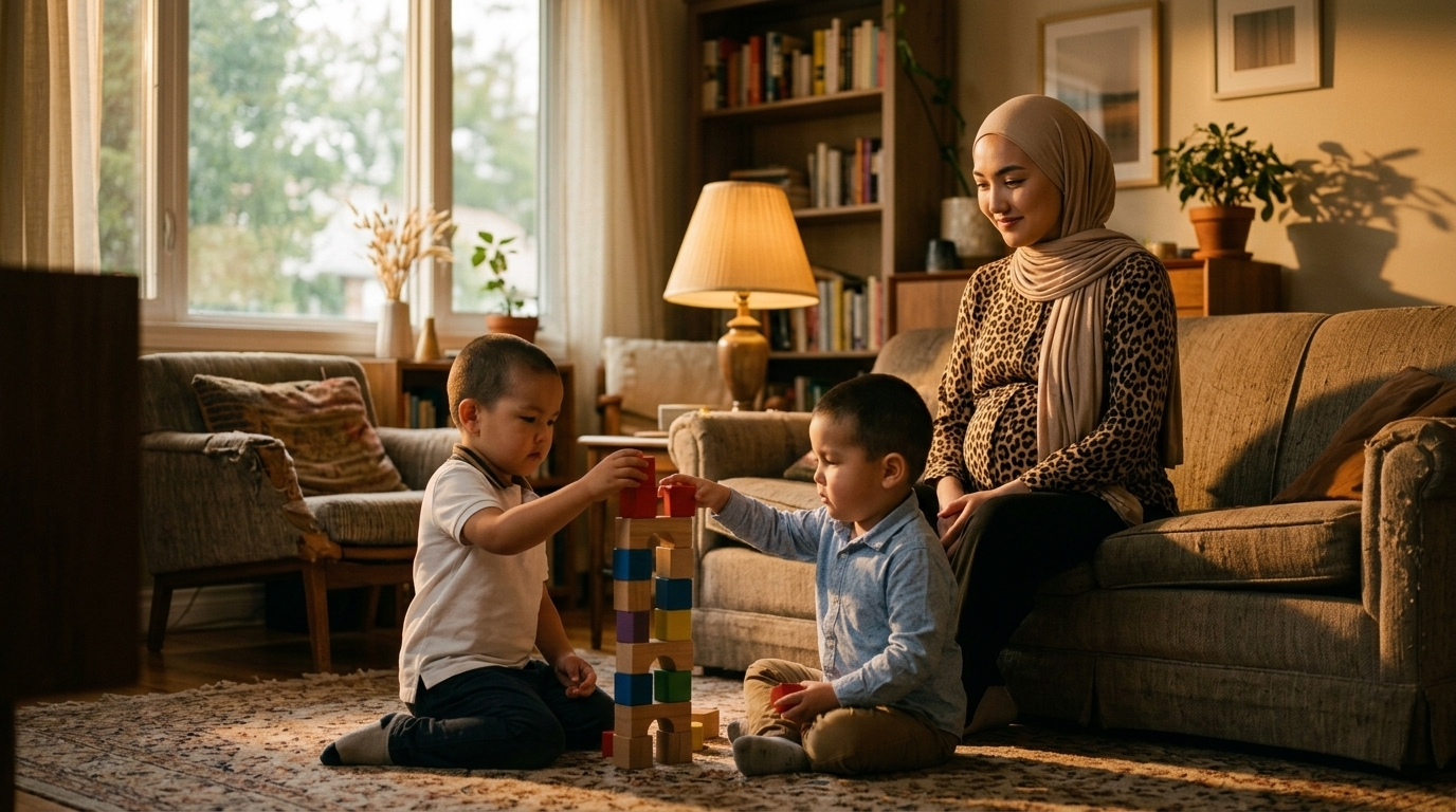 Art style: Кинематографический, реалистичный, с теплой цве.... A cozy yet modest living room, bathed in warm evening light. Sanira, in late pregnancy, sits on the sofa and watches with a tender smile as her sons Muhammad and Ali build a tower of blocks on the carpet. Her face expresses both love and deep weariness, the weight of her thoughts visible on it. ━━━━━━━━━━━━━━━━━━━━━━━━━━━━━━━━━━━━━━ FINAL STYLE ENFORCEMENT (this is the authoritative rendering directive — it overrides any style wording elsewhere in the prompt): Render this image entirely in "Кинематографический, реалистичный, с теплой цве..." style. Match the lighting grammar, material response, colour science, level of realism / stylisation, line weight, and shading model typical of "Кинематографический, реалистичный, с теплой цве...". Keep the subject, composition, camera angle, lighting direction, and colour palette from the description above — but EVERY surface, skin, fabric, material, and environmental element must be rendered in the "Кинематографический, реалистичный, с теплой цве..." idiom, not in any other medium. Character appearance reference (MUST match exactly): - Санира: Strong rule: style --- Кинематографический, реалистичный, с теплой цве... ---. Молодая женщина азиатской внешности с овальным лицом и светлой, безупречной кожей, одетая в плотно прилегающий светло-бежевый хиджаб и блузку с леопардовым принтом. У неё выразительные карие глаза с аккуратной черной подводкой, густые темные брови и полные губы естественного розового оттенка. Выражение лица спокойное и нейтральное, взгляд направлен прямо в объектив. Через плечо виден черный кожаный ремень сумки и ремень безопасности. Телосложение стройное, поза сидячая, фронтальный ракурс, подчеркивающий мягкие черты лица. - Мухаммад: Strong rule: style --- Кинематографический, реалистичный, с теплой цве... ---. Светлый мальчик примерно 4-5 лет с круглым лицом, полными щеками и светлой кожей. У него очень короткая стрижка «под машинку», волосы темного цвета. Глаза темно-карие, миндалевидной формы, взгляд серьезный и спокойный. Он одет в белую футболку-поло с воротником, украшенным коричневыми и черными полосками. Поза строго фронтальная, выражение лица нейтральное и сосредоточенное. Телосложение типичное для дошкольника, хрупкое и аккуратное. - Али: Strong rule: style --- Кинематографический, реалистичный, с теплой цве... ---. Маленький мальчик примерно 2-3 лет с круглым лицом и пухлыми щеками. У него светлая кожа с теплым подтоном и очень короткая стрижка «ежик» темного цвета. Глаза большие, выразительные, темно-карие, почти черные. Нос маленький и аккуратный, губы полные. Он одет в светло-голубую рубашку с мелким темно-синим узором в виде точек. Выражение лица спокойное и серьезное, взгляд направлен прямо в камеру. Поза фронтальная, плечи расправлены.
