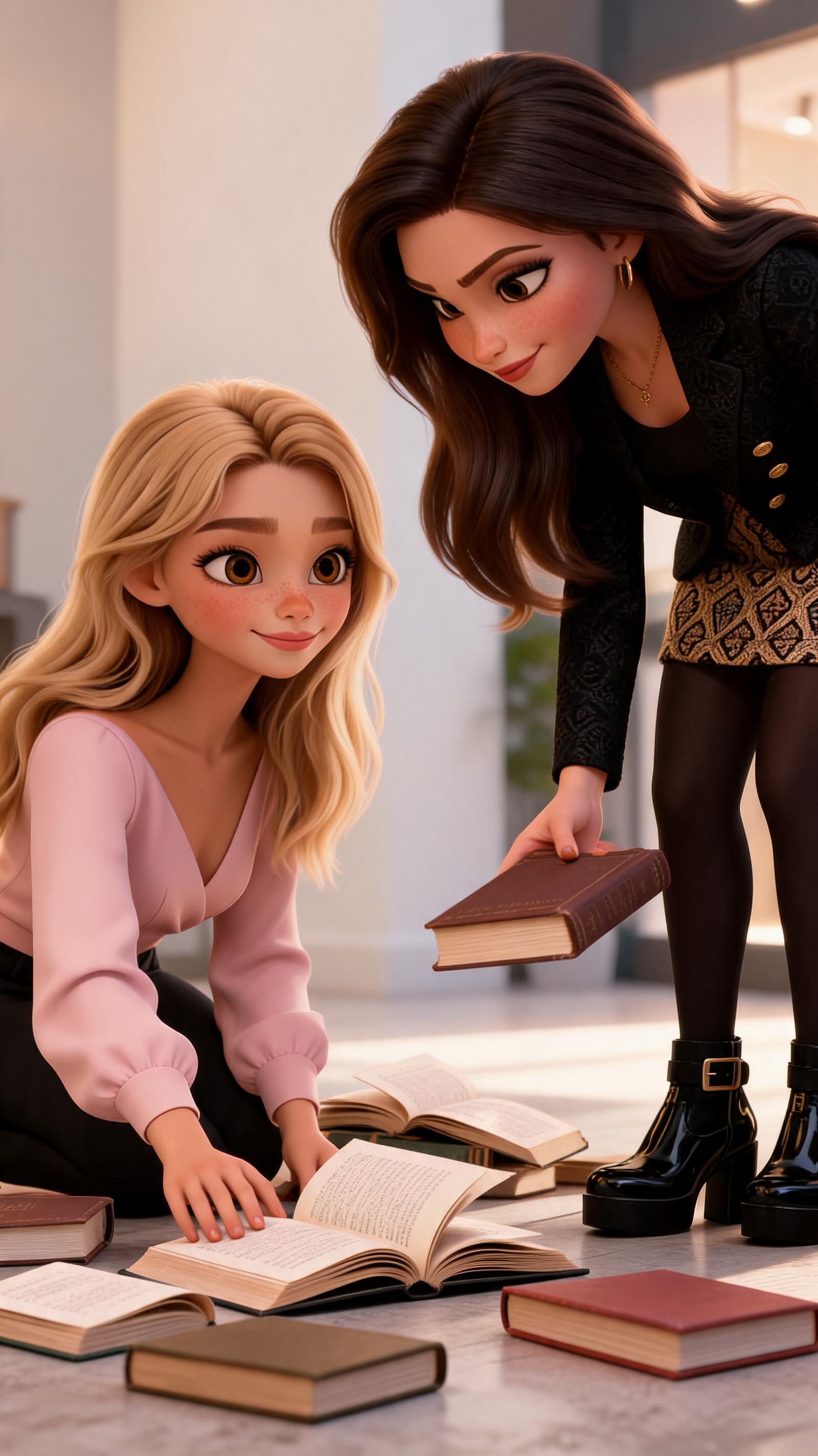 Art style: 3D Pixar. Задиры уходят. Джессика с легкой улыбкой помогает Мие собрать упавшие книги. Мия смотрит на нее с искренней благодарностью. Мягкий, теплый свет возвращается. Стиль Pixar. ━━━━━━━━━━━━━━━━━━━━━━━━━━━━━━━━━━━━━━ FINAL STYLE ENFORCEMENT (this is the authoritative rendering directive — it overrides any style wording elsewhere in the prompt): Render this image entirely in "3D Pixar" style. Match the lighting grammar, material response, colour science, level of realism / stylisation, line weight, and shading model typical of "3D Pixar". Keep the subject, composition, camera angle, lighting direction, and colour palette from the description above — but EVERY surface, skin, fabric, material, and environmental element must be rendered in the "3D Pixar" idiom, not in any other medium. Character appearance reference (MUST match exactly): - Мия: Молодая женщина около 20 лет в стиле 3D-анимации, сердцевидное лицо, светлая кожа с россыпью веснушек на переносице и щеках, длинные густые светлые волосы, уложенные мягкими волнами, огромные выразительные карие глаза с длинными ресницами, стройное телосложение, одета в элегантную нежно-розовую блузку с V-образным вырезом, мягкая приветливая улыбка, уверенный и дружелюбный взгляд, сидит за столом, положив руки на клавиатуру ноутбука. - Джессика: Strong rule: style --- 3D Pixar ---. 17-летняя девушка с длинными темными (брюнетка) волосами и карими глазами. Уверенная и немного высокомерная поза. Одета в дорогую, модную одежду: стильный дизайнерский пиджак, юбка и брендовые туфли. Яркий макияж. Стиль Pixar.