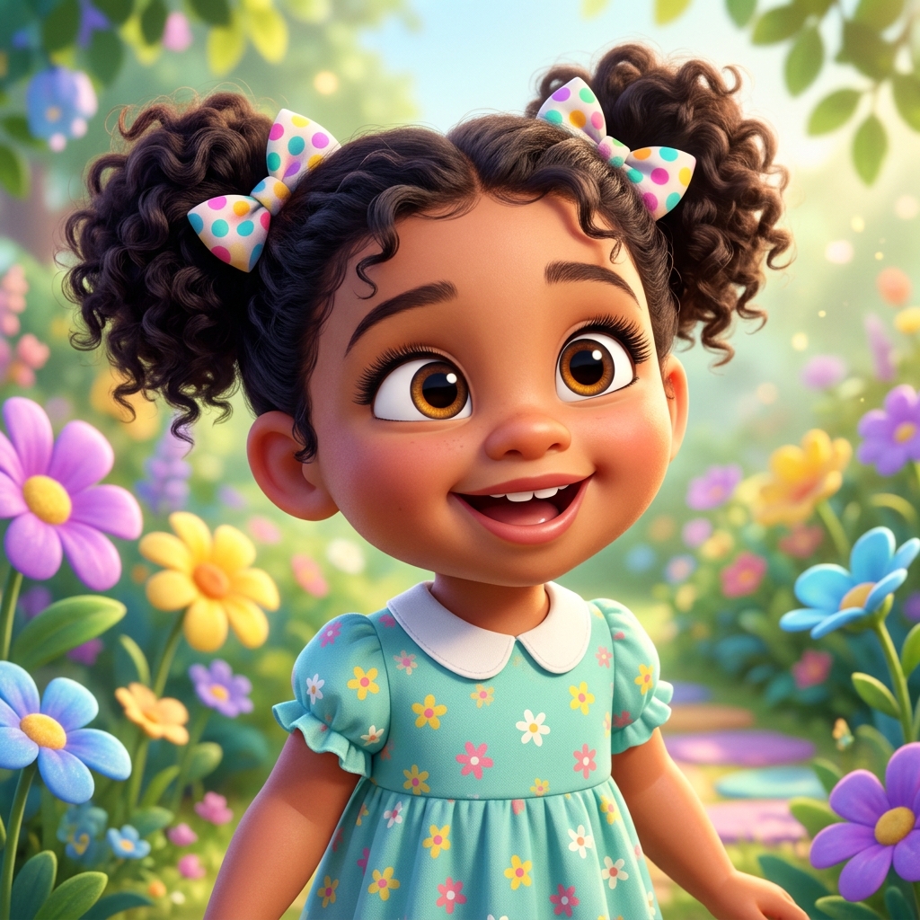 Strong rule: style --- Яркая и красочная 3D-анимация в стиле Pixar, с ... ---. Девочка 4 лет, кудрявые темные волосы, собранные в два хвостика. Большие выразительные карие глаза с длинными черными ресницами. Одета в милое платьице. Веселое и жизнерадостное выражение лица.
