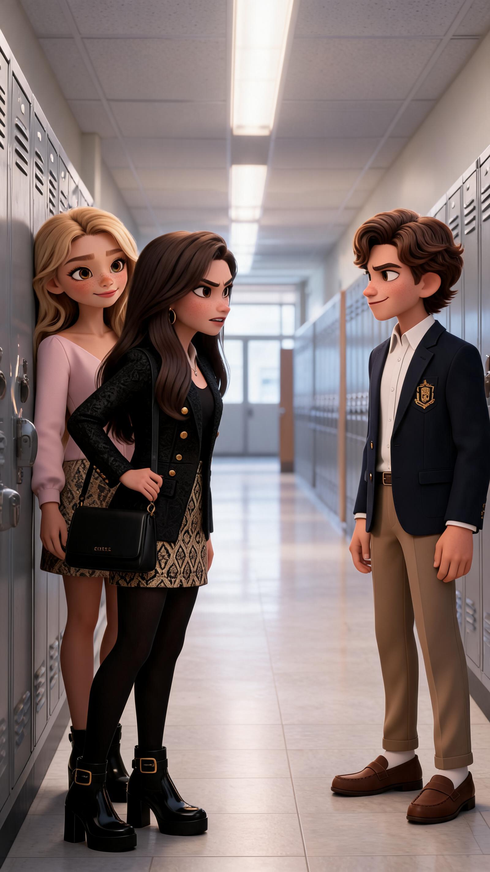 Art style: 3D Pixar. A cinematic medium shot in a bright high school hallway. Jessica, a stylish 17-year-old girl in a designer blazer, steps boldly in front of a shrinking Mia. Jessica looks fiercely at the bullies off-camera, her posture commanding and protective. High-end 3D animation style with soft lighting and depth of field. ━━━━━━━━━━━━━━━━━━━━━━━━━━━━━━━━━━━━━━ FINAL STYLE ENFORCEMENT (this is the authoritative rendering directive — it overrides any style wording elsewhere in the prompt): Render this image entirely in "3D Pixar" style. Match the lighting grammar, material response, colour science, level of realism / stylisation, line weight, and shading model typical of "3D Pixar". Keep the subject, composition, camera angle, lighting direction, and colour palette from the description above — but EVERY surface, skin, fabric, material, and environmental element must be rendered in the "3D Pixar" idiom, not in any other medium. Character appearance reference (MUST match exactly): - Мия: Молодая женщина около 20 лет в стиле 3D-анимации, сердцевидное лицо, светлая кожа с россыпью веснушек на переносице и щеках, длинные густые светлые волосы, уложенные мягкими волнами, огромные выразительные карие глаза с длинными ресницами, стройное телосложение, одета в элегантную нежно-розовую блузку с V-образным вырезом, мягкая приветливая улыбка, уверенный и дружелюбный взгляд, сидит за столом, положив руки на клавиатуру ноутбука. - Джессика: Strong rule: style --- 3D Pixar ---. 17-летняя девушка с длинными темными (брюнетка) волосами и карими глазами. Уверенная и немного высокомерная поза. Одета в дорогую, модную одежду: стильный дизайнерский пиджак, юбка и брендовые туфли. Яркий макияж. Стиль Pixar. - Задира: Strong rule: style --- 3D Pixar ---. Школьник 17 лет, каштановый волос, богатый ребенок