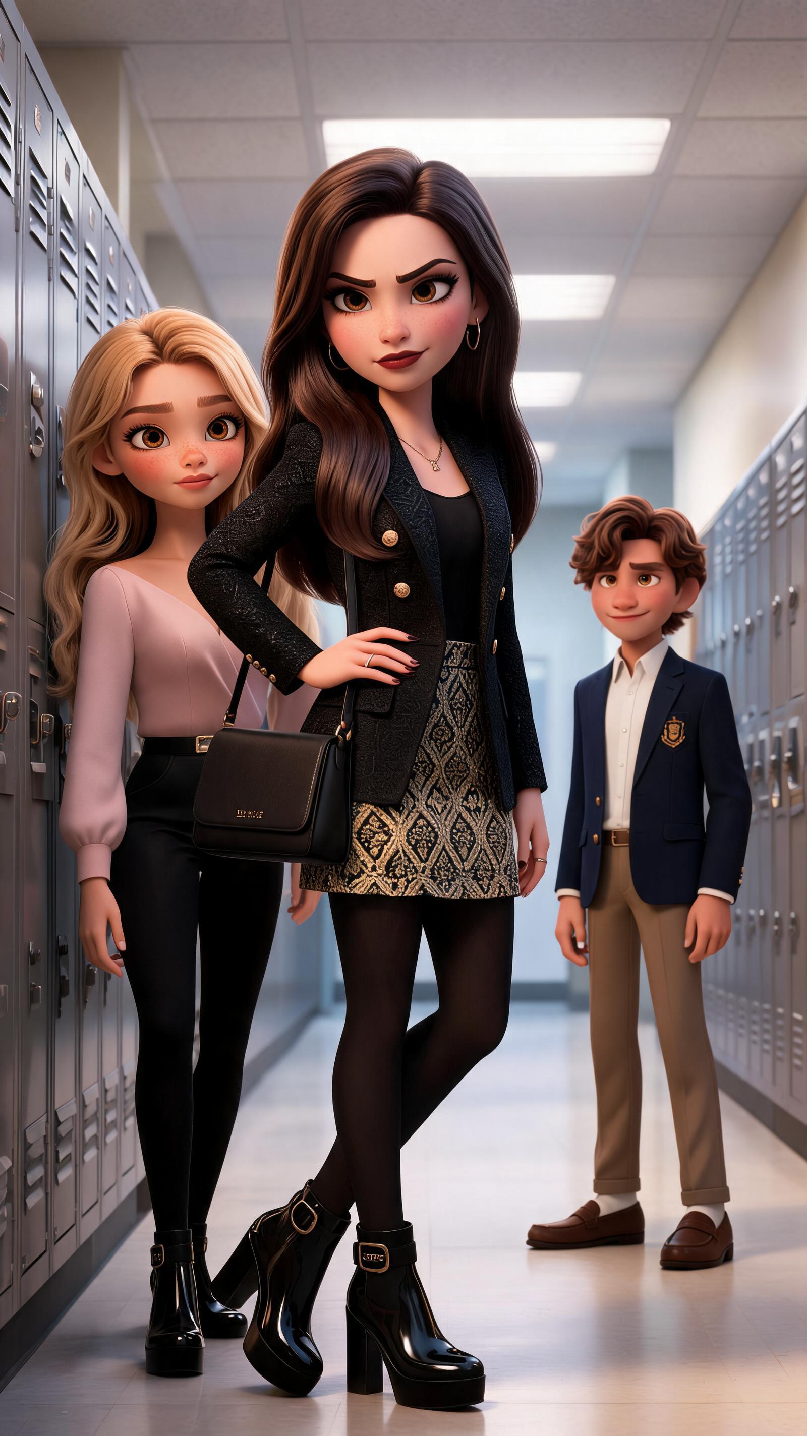 Art style: 3D Pixar. A cinematic medium shot in a bright high school hallway. Jessica, a stylish 17-year-old girl in a designer blazer, steps boldly in front of a shrinking Mia. Jessica looks fiercely at the bullies off-camera, her posture commanding and protective. High-end 3D animation style with soft lighting and depth of field. ━━━━━━━━━━━━━━━━━━━━━━━━━━━━━━━━━━━━━━ FINAL STYLE ENFORCEMENT (this is the authoritative rendering directive — it overrides any style wording elsewhere in the prompt): Render this image entirely in "3D Pixar" style. Match the lighting grammar, material response, colour science, level of realism / stylisation, line weight, and shading model typical of "3D Pixar". Keep the subject, composition, camera angle, lighting direction, and colour palette from the description above — but EVERY surface, skin, fabric, material, and environmental element must be rendered in the "3D Pixar" idiom, not in any other medium. Character appearance reference (MUST match exactly): - Мия: Молодая женщина около 20 лет в стиле 3D-анимации, сердцевидное лицо, светлая кожа с россыпью веснушек на переносице и щеках, длинные густые светлые волосы, уложенные мягкими волнами, огромные выразительные карие глаза с длинными ресницами, стройное телосложение, одета в элегантную нежно-розовую блузку с V-образным вырезом, мягкая приветливая улыбка, уверенный и дружелюбный взгляд, сидит за столом, положив руки на клавиатуру ноутбука. - Джессика: Strong rule: style --- 3D Pixar ---. 17-летняя девушка с длинными темными (брюнетка) волосами и карими глазами. Уверенная и немного высокомерная поза. Одета в дорогую, модную одежду: стильный дизайнерский пиджак, юбка и брендовые туфли. Яркий макияж. Стиль Pixar. - Задира: Strong rule: style --- 3D Pixar ---. Школьник 17 лет, каштановый волос, богатый ребенок