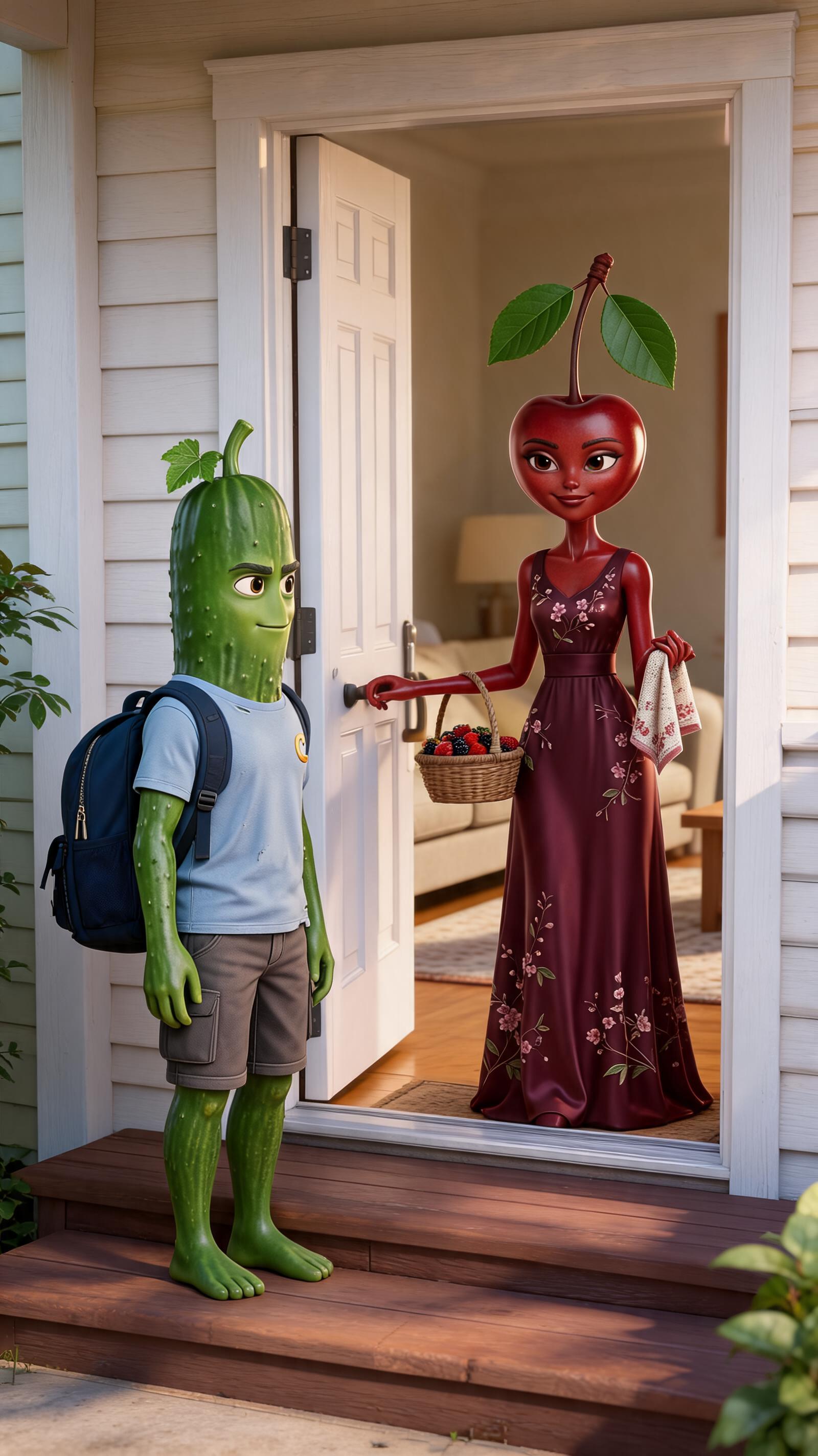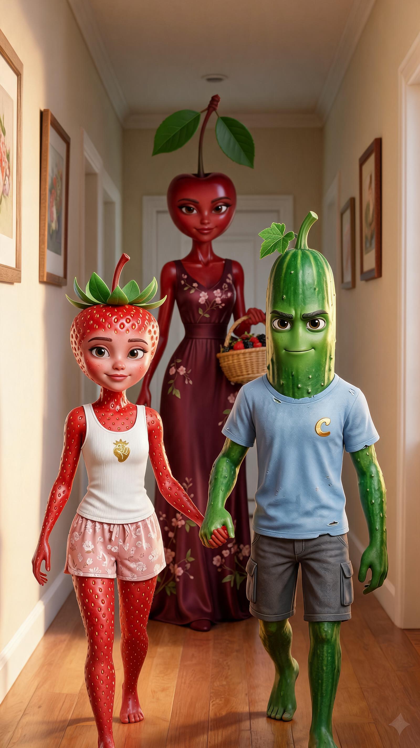 Art style: 3D Pixar. Крупный план на измученном лице мальчика-огурца, который лежит в кровати. Мама-вишня и девочка-клубника смотрят на него с крайним удивлением. Стиль 3D Pixar. ━━━━━━━━━━━━━━━━━━━━━━━━━━━━━━━━━━━━━━ FINAL STYLE ENFORCEMENT (this is the authoritative rendering directive — it overrides any style wording elsewhere in the prompt): Render this image entirely in "3D Pixar" style. Match the lighting grammar, material response, colour science, level of realism / stylisation, line weight, and shading model typical of "3D Pixar". Keep the subject, composition, camera angle, lighting direction, and colour palette from the description above — but EVERY surface, skin, fabric, material, and environmental element must be rendered in the "3D Pixar" idiom, not in any other medium. Character appearance reference (MUST match exactly): - Огурчик: Антропоморфный огурец мужского пола, выглядящий как молодой человек, с вытянутой цилиндрической головой и телом. Кожа ярко-зеленая, покрытая характерными пупырышками по всей поверхности. Вместо волос на макушке расположен зеленый стебель с небольшим листком. У него крупные темные глаза, густые брови и уверенная, слегка дерзкая ухмылка. Телосложение стройное и атлетичное, с человекоподобными конечностями. Одет в поношенную голубую футболку с золотистой буквой «C» на груди и серые шорты-карго. Персонаж стоит прямо, руки расслабленно опущены вдоль туловища, босые зеленые ступни плотно прижаты к полу. - Мама Вишня: Антропоморфная женщина-вишня средних лет с глянцевой темно-красной кожей и лицом в форме сердца. Вместо волос на голове длинный коричневый черешок с двумя крупными зелеными листьями. У нее большие карие глаза с густыми ресницами и нежная, приветливая улыбка. Стройная и изящная фигура облачена в длинное в пол бордовое платье без рукавов с нежным цветочным узором. В одной руке она держит маленькую плетеную корзинку с ягодами, а в другой — светлый узорчатый платок. Поза грациозная и спокойная.