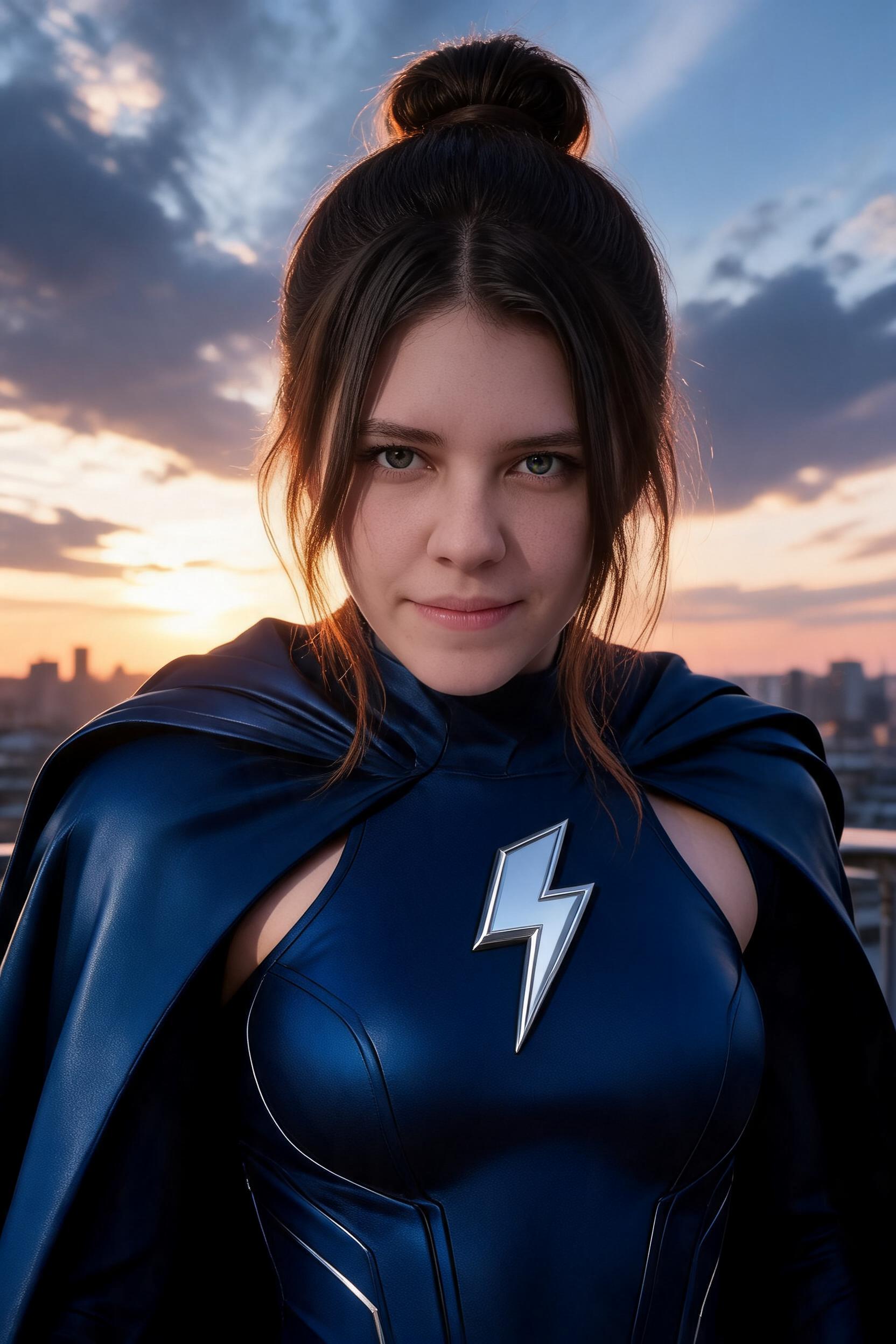 Создай портрет девушки сохраняя черты лица в образе супергероя. Волосы собраны в пучок,несколько прядей выступает.