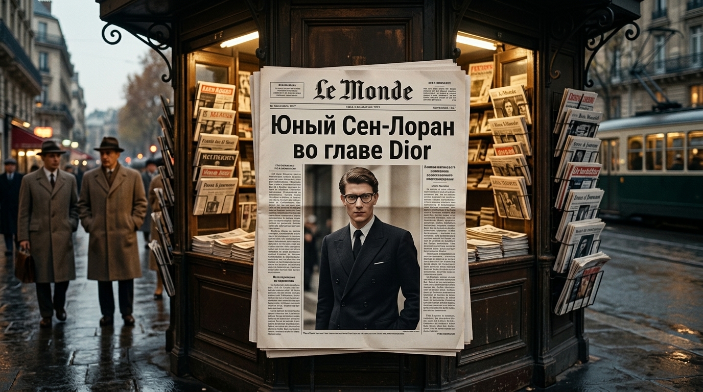 Art style: Динамичный, современный глянцевый стиль. Сочета.... Стилизация под обложку винтажного журнала Harper's Bazaar. В центре — знаменитая фотография модели в жакете "Bar". Заголовок "THE NEW LOOK" появляется поверх изображения. ━━━━━━━━━━━━━━━━━━━━━━━━━━━━━━━━━━━━━━ FINAL STYLE ENFORCEMENT (this is the authoritative rendering directive — it overrides any style wording elsewhere in the prompt): Render this image entirely in "Динамичный, современный глянцевый стиль. Сочета..." style. Match the lighting grammar, material response, colour science, level of realism / stylisation, line weight, and shading model typical of "Динамичный, современный глянцевый стиль. Сочета...". Keep the subject, composition, camera angle, lighting direction, and colour palette from the description above — but EVERY surface, skin, fabric, material, and environmental element must be rendered in the "Динамичный, современный глянцевый стиль. Сочета..." idiom, not in any other medium.